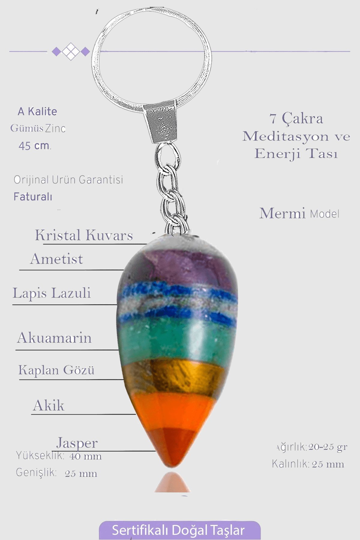 Bu tasarımımızda; %100 Doğal 7 Çakra Doğal Taş kullanılmıştır.