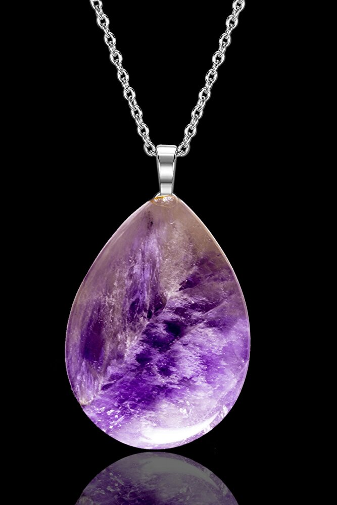 Sertifikalı Damla Model Gerçek Ametist Taşı Kolye (GÜMÜŞ ZİNCİRLİ)