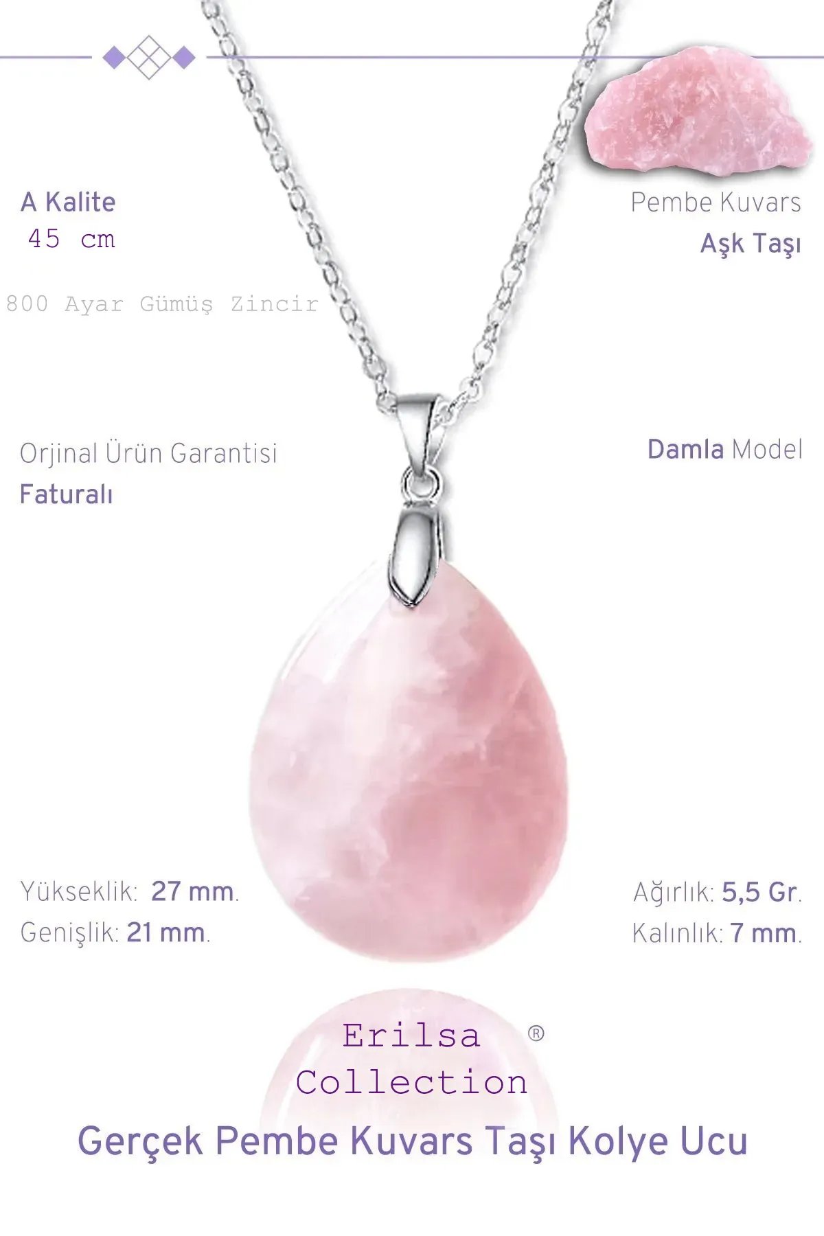 Sertifikalı Damla Model Gerçek Pembe Kuvars Taşı Kolye (Gümüş Aparat)