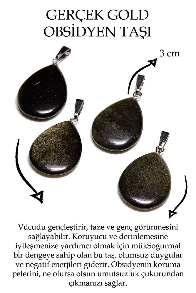 Bu doğal taş kolye tasarımımızda; Gold Obsidyen taşı kullanılmıştır. Zincir ölçüsü 45 cm\'dir. Her için uyumludur. Yetişkin ve çocuk için kullanılabilir. %100 Orijinal ve gerçek taştır. Sinirinizi stresinizi alacak, mineral açısından oldukça zengin olduğu için bulunduğu için teniniz ile temas eder etmez aradaki farkı kısa bir süre içinde hissedeceksiniz.