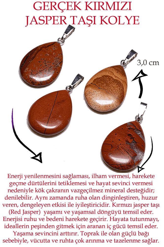 Bu doğal taş kolye tasarımımızda; jasper Taşı kullanılmıştır. Zincir ölçüsü 45 cm\'dir. Her için uyumludur. Yetişkin ve çocuk için kullanılabilir. %100 Orijinal ve gerçek taştır. Sinirinizi stresinizi alacak, mineral açısından oldukça zengin olduğu için bulunduğu için teniniz ile temas eder etmez aradaki farkı kısa bir süre içinde hissedeceksiniz.