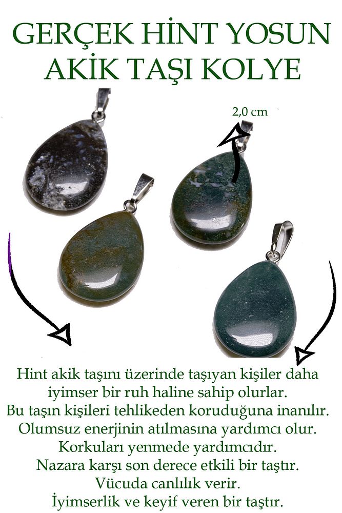Bu doğal taş kolye tasarımımızda; Hint Akik Taşı kullanılmıştır. Zincir ölçüsü 45 cm\'dir. Her için uyumludur. Yetişkin ve çocuk için kullanılabilir. %100 Orijinal ve gerçek taştır. Sinirinizi stresinizi alacak, mineral açısından oldukça zengin olduğu için bulunduğu için teniniz ile temas eder etmez aradaki farkı kısa bir süre içinde hissedeceksiniz.