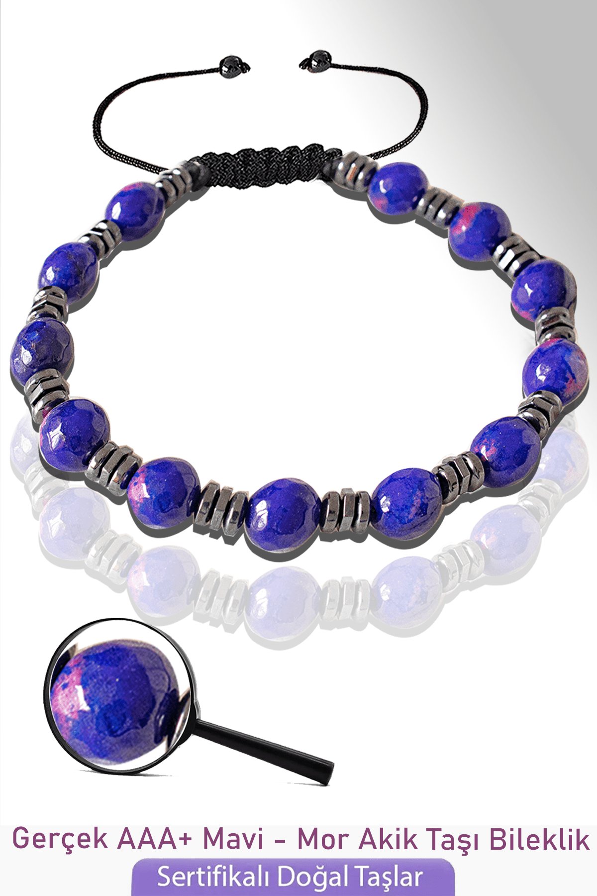 Sertifikalı Fasetli Gerçek Mavi Mor Akik Taşı Bileklik - Ayarlamalı
