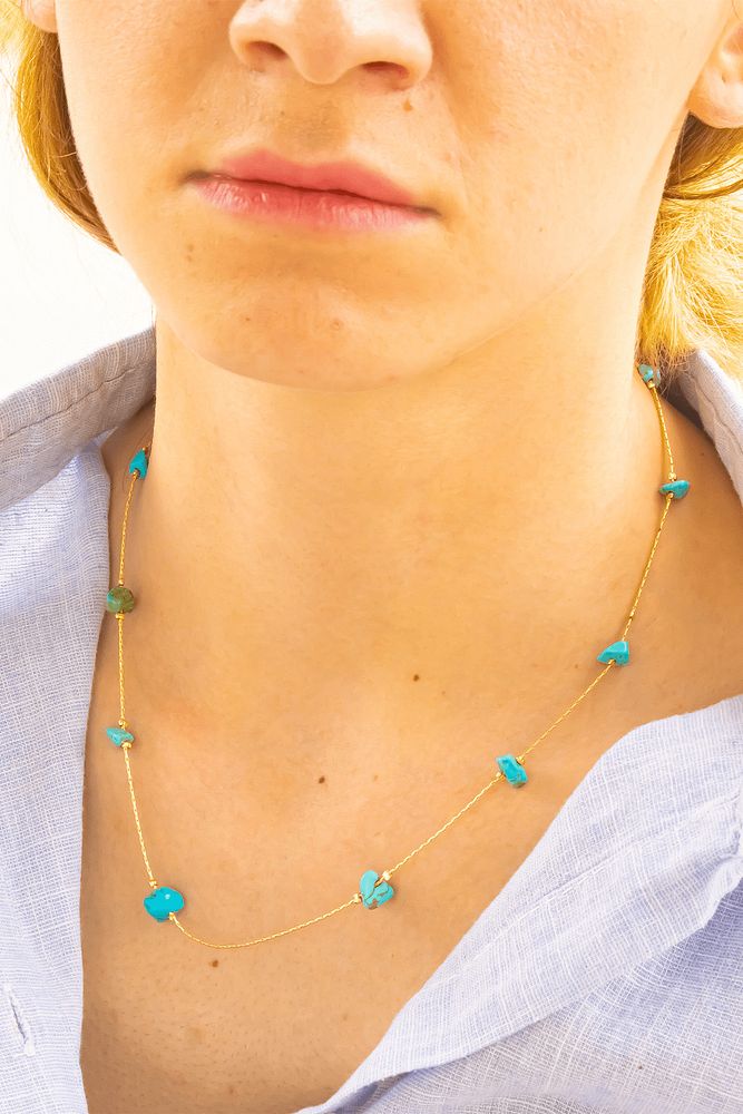 Bu doğal taş kolye tasarımımızda; Firuze taşı kullanılmıştır. Zincir ölçüsü 45 cm'dir. Her için uyumludur. Yetişkin ve çocuk için kullanılabilir. %100 Orijinal ve gerçek taştır. Sinirinizi stresinizi alacak, mineral açısından oldukça zengin olduğu için bulunduğu için teniniz ile temas eder etmez aradaki farkı kısa bir süre içinde hissedeceksiniz.