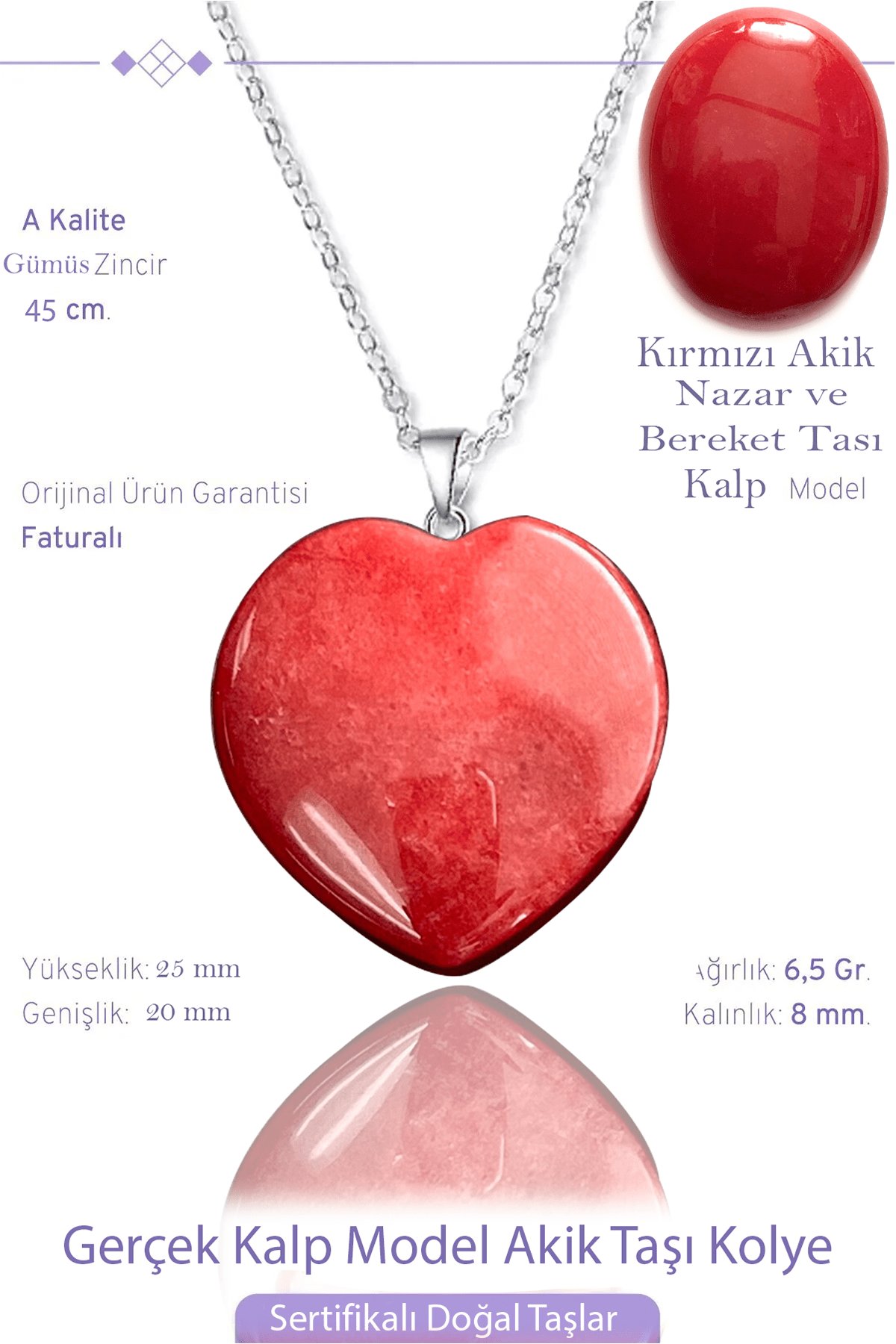 Sertifikalı Gerçek Kalp Model Bayrak Kırmızısı Akik Taşı Kolye