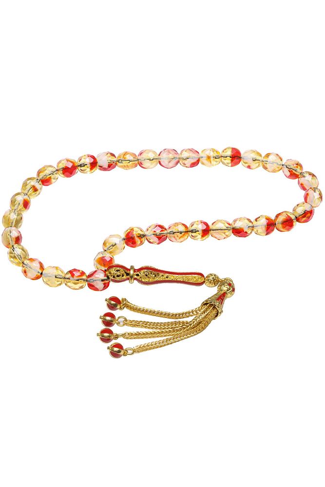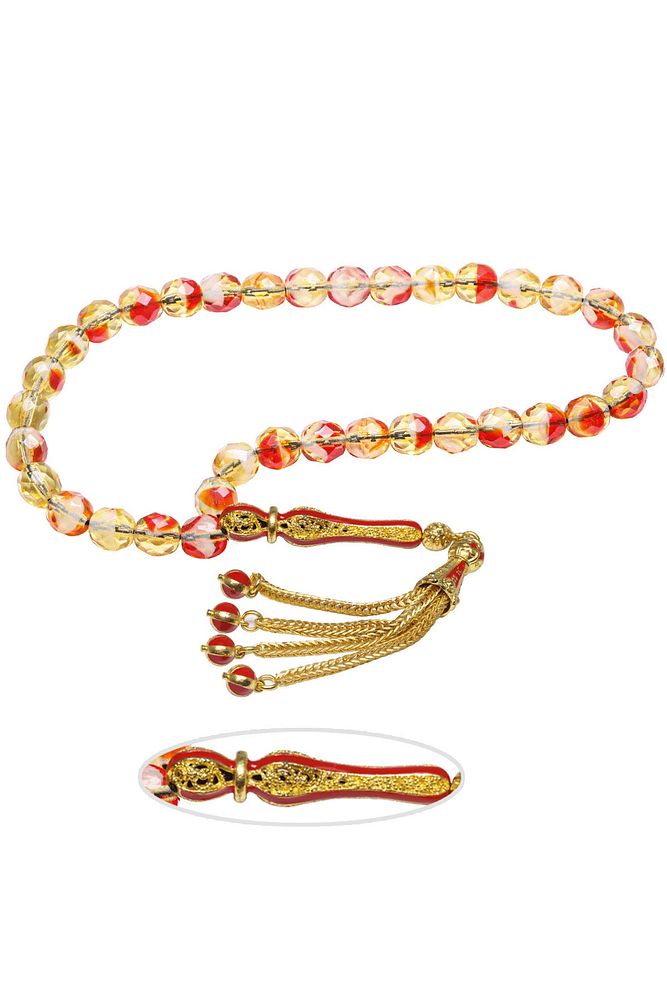 Ürün ya da Doğal Taş Açıklaması (Para - Sağlık - Pozitif Enerji Taşı) Kuvars tesbih modelleri, ''Tesbih Atölyesi'' Atölyelerinde ustalarımız tarafından kuru torna işciliği ile elde özen ile tane tane işlenmektedir. Ürünlerimiz el işciliği olduğu için sınırlı sayıda üretilmektedir. Tasarımlarımızda kullandığımız taşlar Dünya'nın en kaliteli doğal taşlarını kullanmaktayız. Tasarımlarımızda kullandığımız doğal taşların hiç biri birbirinin aynısı olmadığı için küçükte olsa farklılık gösterebilir. Doğal taşlar vücudunuza temas ettiği anda negatif enerjilerinizi alır ve pozitif enerjiler verir. Bu tasarımda; Kırmızı beyaz renkli fasetli kuvars taşı ve Sarı altın kaplama kırmızı mineli telkari imame ve püskül seti kullanılmıştır. Çift kaplama atıldığı için renk atmaz ve kararmaz bir yapıya sahiptir. Yedek ip ile gönderim sağlanır. Üretildiği Taş; Kuvars; Ana Renk; Doğal Renk; Ağırlık; 20-30 gr; Tane Şekli; 8x8 mm; Tane Ölçüsü; Küre Kesim; Toplam Uzunluk; 20-30cm; İmame ve Püskül Maddesi; Düşük Ayar Gümüş;