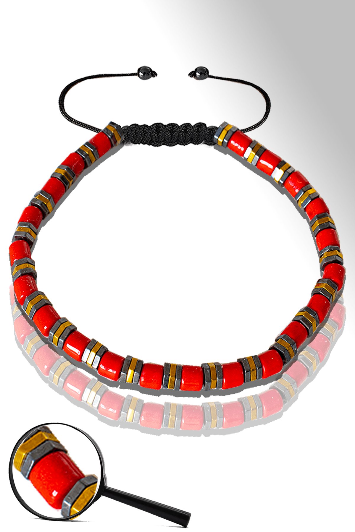 Sertifikalı Gold Silver Hematitli Kırmızı Mercan Taşı Bileklik - Ayarlamalı