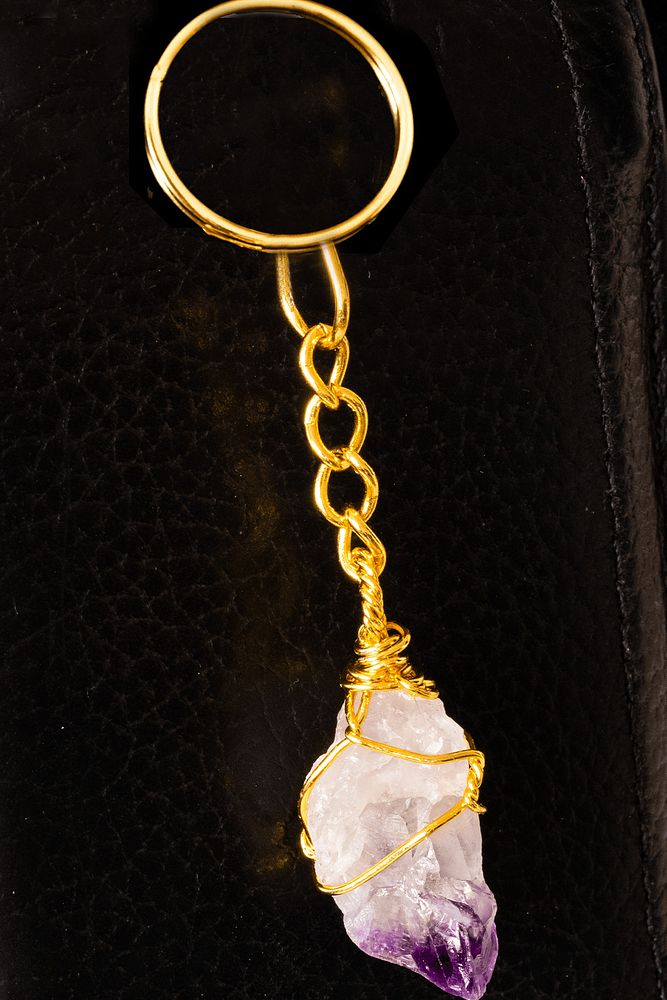 Sertifikalı Gold Tel Sargılı Ametist Taşı Anahtarlık