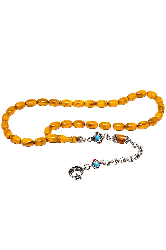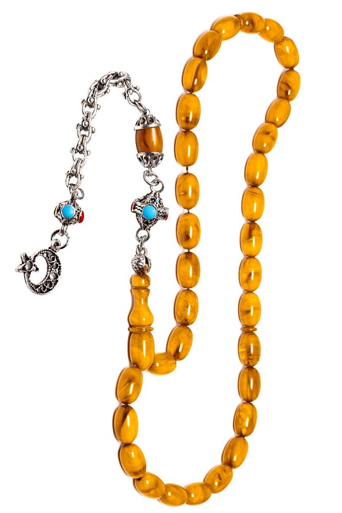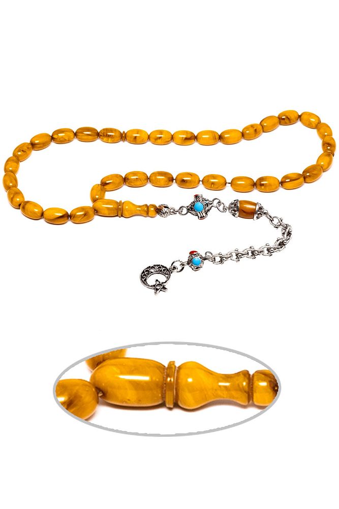 Ürün ya da Doğal Taş Açıklaması; ; (Baş Ağrısı Sinir ve Stres); ; Tesbih Atölyesi, Sıkma kehribar tesbih, tasarımları özel olarak usta ellerde tasarlanır. Tasarımlarımız el yapımı olup sınırlı adette üretilmektedir. Tasarımlarda kullanılan püsküller düşük ayar gümüşten imal edilir. Tasarımlarda kullanılan kehribar taneleri hareli özel kalıplardan yapılır. Yapay reçine ile üretilmektedir. Ürünlerimiz renk almakta ve koku vermektedirler. ; ; Bu tasarımda; Yoğun sarı renkli muhteşem kalitede 1.kalite sıkma kehribar reçine kullanılmıştır. Her kehribar tanesi birbirinin aynısı olmadığı için küçükte olsa farklılıklar gösterebilir.; ; Üretildiği Malzeme; Sıkma Kehribar; Ana Renk; Sarı Renk; Ağırlık; 20-30 gr; Tane Şekli; 8x12 mm; Tane Ölçüsü; Kapsül Kesim; Toplam Uzunluk; 20-30 cm; İmame ve Püskül Maddesi; Düşük Ayar Gümüş;
