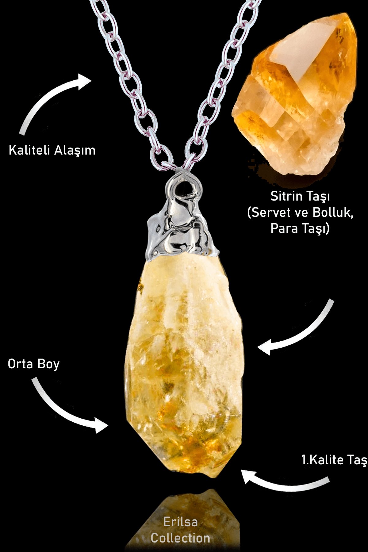 Sitrin Taşı Doğal Taş Kolye, modellerimizin taşlarını Dünya'nın çeşitli ülkelerinden ithal etmekteyiz. Dünya'nın en kaliteli taşlarını özel olarak tasarım ekibimiz tarafınca tasarlamaktayız. Taşın içerisindeki mineraller teniniz ile temas eder ve sizleri sakinleştirir.