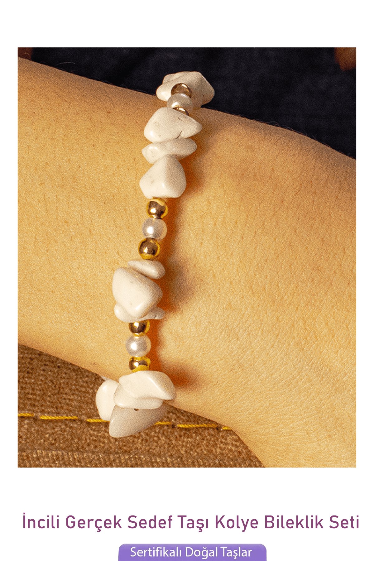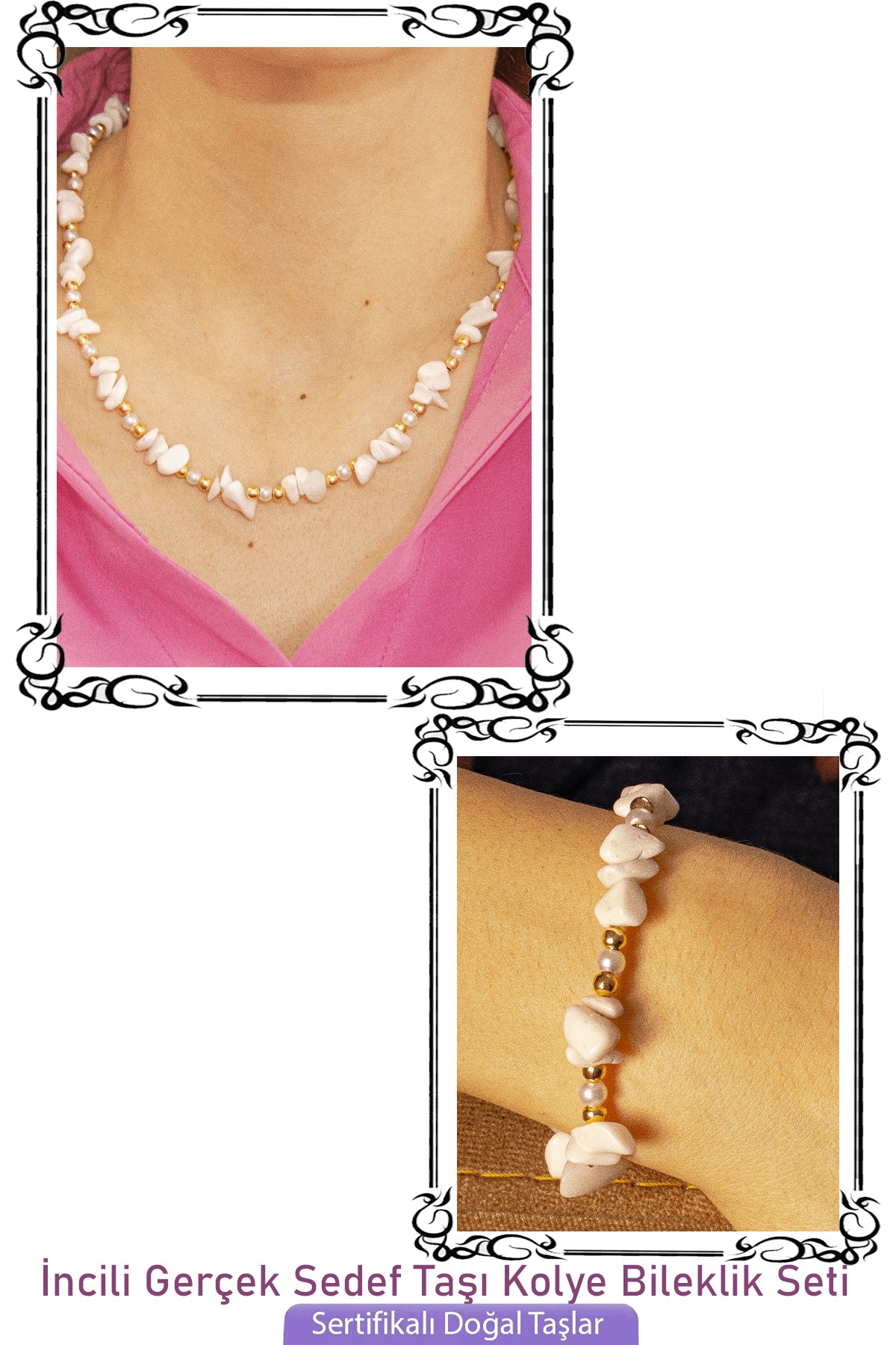 Sertifikalı İncili Beyaz Sedef Taşlı Doğal Taş Kolye Bileklik Seti