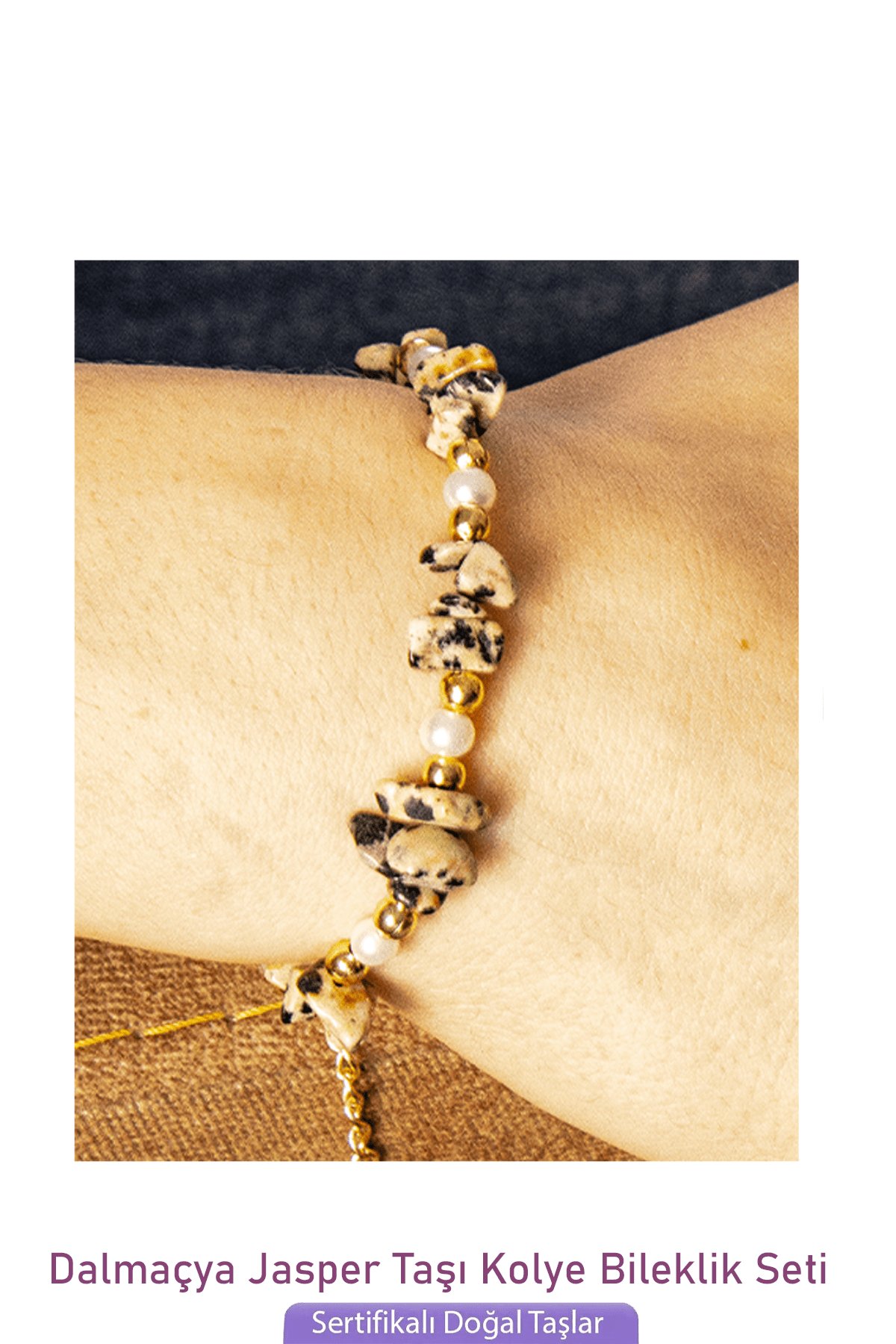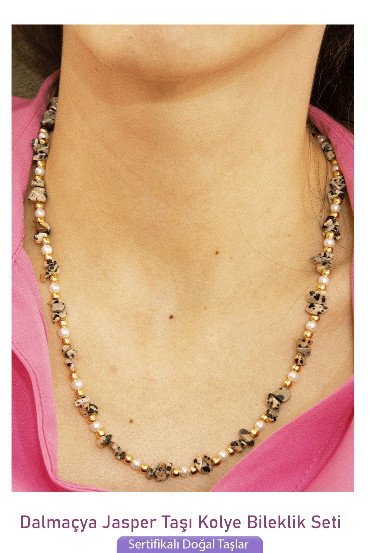 Sertifikalı İncili Dalmaçya Jasper Taşlı Doğal Taş Kolye Bileklik Seti