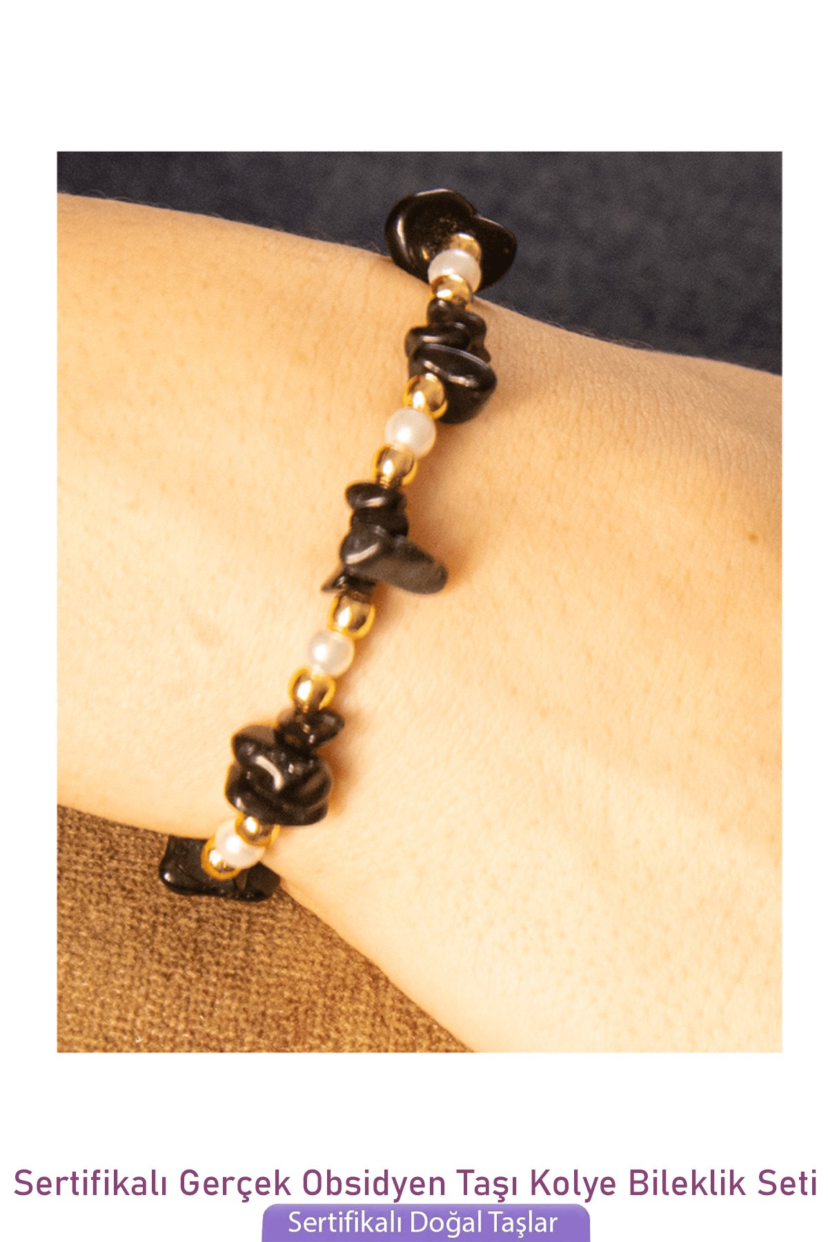 Sertifikalı İncili Siyah Obsidyen Taşlı Doğal Taş Kolye Bileklik Seti
