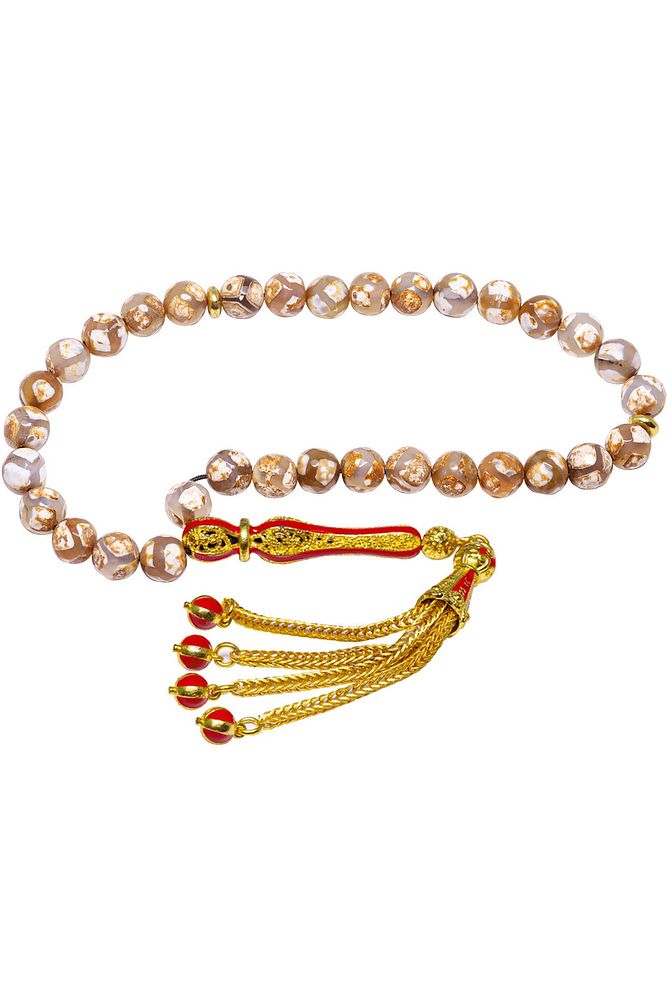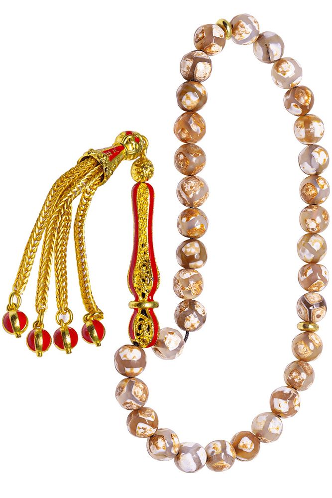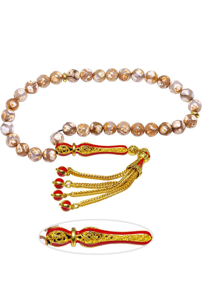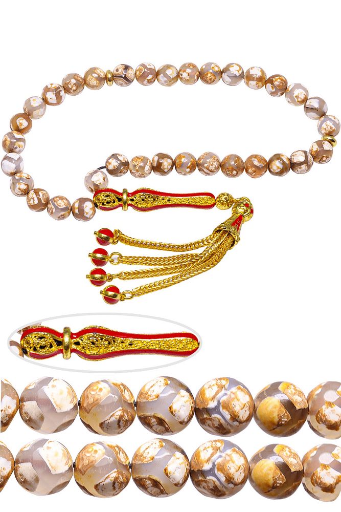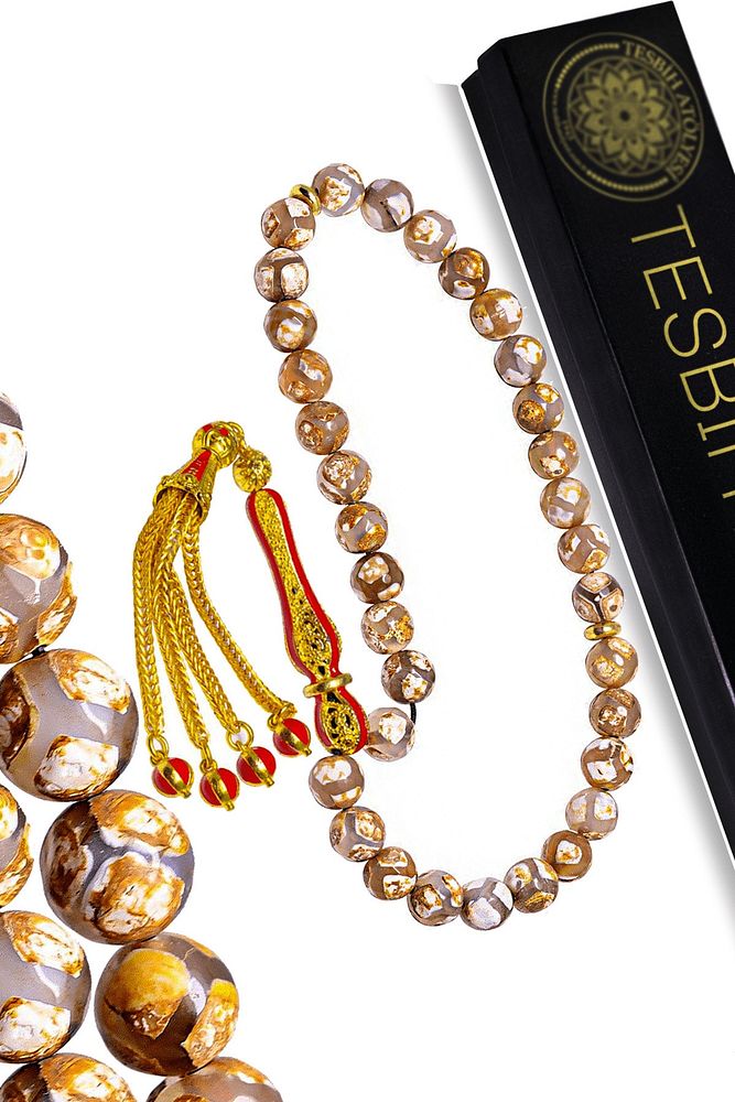 (Para, Bereket ve Pozitif Enerji Taşı) Akik tesbih modelleri, ''Tesbih Atölyesi'' Atölyelerinde ustalarımız tarafından kuru torna işciliği ile elde özen ile tane tane işlenmektedir. Ürünlerimiz el işciliği olduğu için sınırlı sayıda üretilmektedir. Tasarımlarımızda kullandığımız taşlar Dünya'nın en kaliteli akik taşlarını kullanmaktayız. Tasarımlarımızda kullandığımız doğal taşların hiç biri birbirinin aynısı olmadığı için küçükte olsa farklılık gösterebilir. Vücudunuza temas ettiği anda negatif enerjilerinizi alır ve pozitif enerjiler verir. Yedek ipi gönderilir ve ürünlerimiz ''Tesbih Atölyesi'' koruyucu ağaç kutusu ile gönderilmektedir. Bu tasarımın yapımında; Beyaz damarlı doğal tibet akik taşı kullanılmıştır. İmame ve püskül tasarımında; Sarı kırmızı mineli 24 ayar altın kaplama telkari imame ve püskül seti kullanılmıştır. Çift kaplama atıldığı için renk atmaz ve kararmaz bir yapıya sahiptir. Üretildiği Taş; Akik Taşı; Ana Renk; Doğal Renk; Ağırlık; 20-30 gr; Tane Şekli; 8x8 mm; Tane Ölçüsü; Küre Kesim; Toplam Uzunluk; 20-30 cm; İmame ve Püskül Maddesi; Düşük Ayar Gümüş;