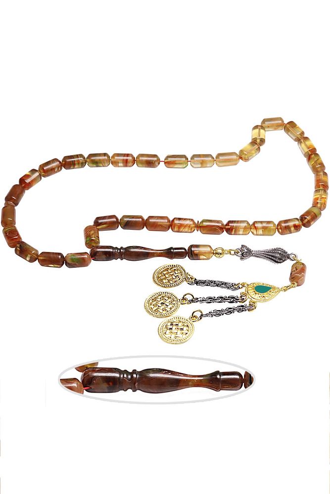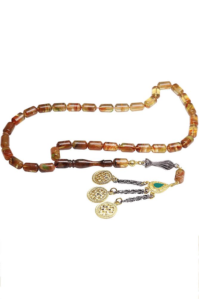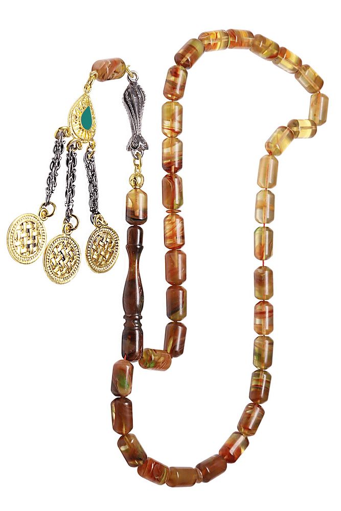 (Baş Ağrısı Sinir ve Stres); ; Tesbih Atölyesi, Sıkma kehribar tesbih, tasarımları özel olarak usta ellerde tasarlanır. Tasarımlarımız el yapımı olup sınırlı adette üretilmektedir. Tasarımlarda kullanılan püsküller düşük ayar gümüşten imal edilir. Tasarımlarda kullanılan kehribar taneleri hareli özel kalıplardan yapılır. Yapay reçine ile üretilmektedir. Ürünlerimiz renk almakta ve koku vermektedirler. ; ; Bu tasarımda; Renk hareli özel yeşil ve kahverengi renklerinden oluşan renk alan kaliteli sıkma kehribar reçine kullanılmıştır. Her kehribar tanesi birbirinin aynısı olmadığı için küçükte olsa farklılıklar gösterebilir.; ; Üretildiği Malzeme; Sıkma Kehribar; Ana Renk; Yeşil ve Kahverengi Renk; Ağırlık; 20-30 gr; Tane Şekli; 8x12 mm; Tane Ölçüsü; Kapsül Kesim; Toplam Uzunluk; 20-30 cm; İmame ve Püskül Maddesi; Düşük Ayar Gümüş ;