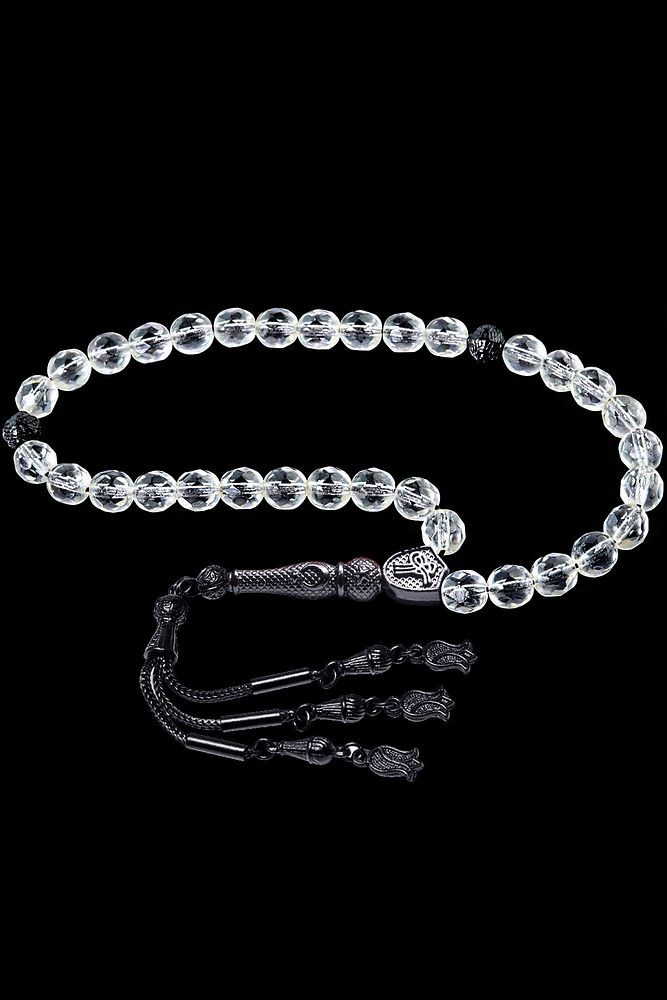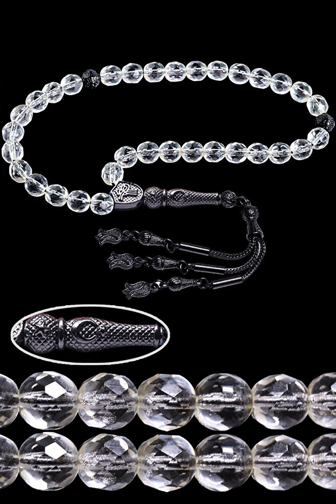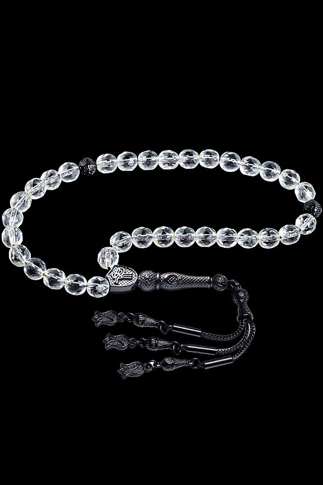 (Dağ Kristali Sinir ve Stres Taşı); ; Necef taşı tesbih modelleri, Dünya\'nın en kaliteli necef taşlarını kullanmaktayız. Zaman içerisinde oluşan kuvars taşlarının içerisine su dolması ile arasındaki çatlaklara yayılması sonucu oluşmaktadır. Ürünlerimiz el işciliği olduğu için sınırlı sayıda üretilmektedir. Tasarımlarımızda kullandığımız taşları Dünya\'nın en kaliteli doğal taşlarını ithal etmekteyiz. Tasarımlarımızda kullandığımız doğal taşların hiç biri birbirinin aynısı olmadığı için küçükte olsa farklılık gösterebilir. ; ; Bu tasarımda; Doğal İran necef kristali kullanılmıştır. Siyah nikel alaşımlı imame ve püskül seti kullanılmıştır. Çift kaplama atıldığı için renk atmaz ve kararmaz bir yapıya sahiptir. Yedek ip ile gönderim sağlanır. ; Üretildiği Taş; Necef Taşı; Ana Renk; Doğal Renk; Ağırlık; 20-30 gr; Tane Şekli; 8x8 mm; Tane Ölçüsü; Küre Kesim; Toplam Uzunluk; 20-30 cm; İmame ve Püskül Maddesi; Nikel Alaşımlı;