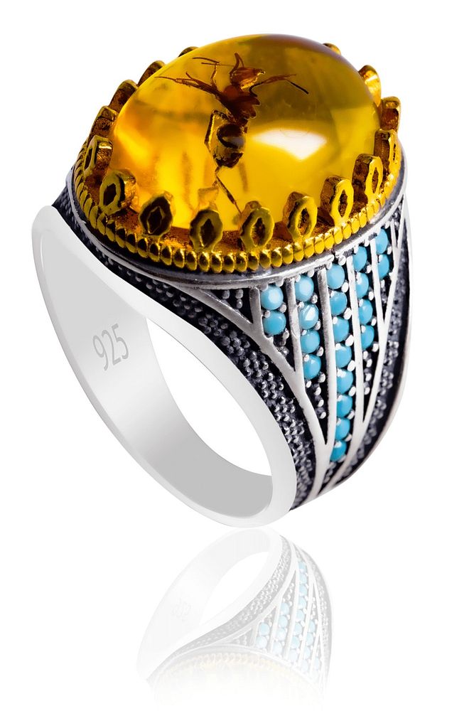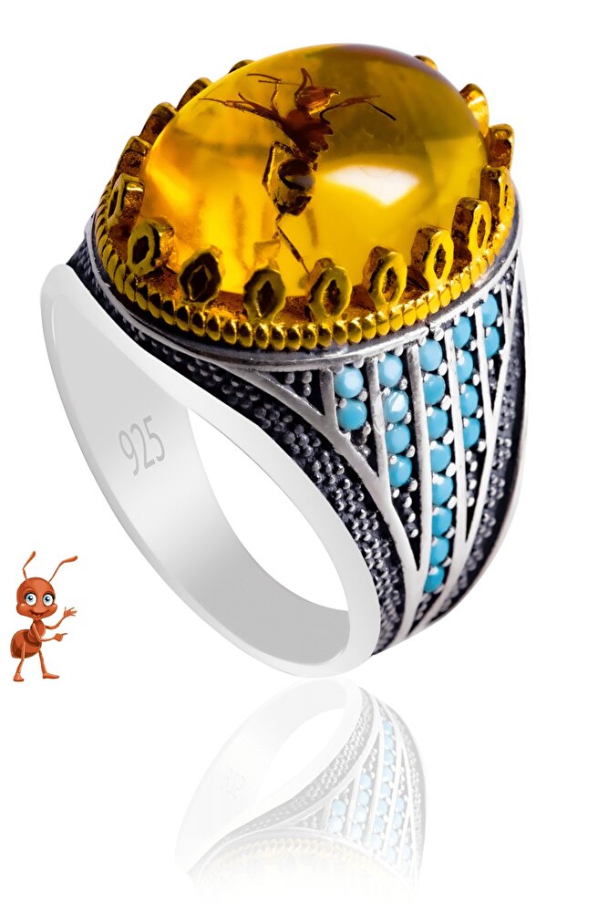 Sertifikalı Karınca Fosilli Kehribar Taşlı Gümüş Yüzük