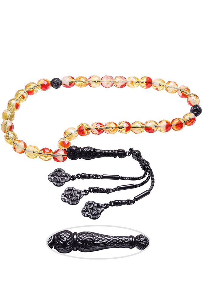 Ürün ya da Doğal Taş Açıklaması (Para - Sağlık - Pozitif Enerji Taşı) Kuvars tesbih modelleri, \'\'Tesbih Atölyesi\'\' Atölyelerinde ustalarımız tarafından kuru torna işciliği ile elde özen ile tane tane işlenmektedir. Ürünlerimiz el işciliği olduğu için sınırlı sayıda üretilmektedir. Tasarımlarımızda kullandığımız taşlar Dünya\'nın en kaliteli doğal taşlarını kullanmaktayız. Tasarımlarımızda kullandığımız doğal taşların hiç biri birbirinin aynısı olmadığı için küçükte olsa farklılık gösterebilir. Doğal taşlar vücudunuza temas ettiği anda negatif enerjilerinizi alır ve pozitif enerjiler verir. Bu tasarımda; Kırmızı beyaz renkli fasetli kuvars taşı ve Siyah nikel alaşımlı imame ve püskül seti kullanılmıştır. Çift kaplama atıldığı için renk atmaz ve kararmaz bir yapıya sahiptir. Yedek ip ile gönderim sağlanır. Üretildiği Taş; Kuvars; Ana Renk; Doğal Renk; Ağırlık; 40-50 gr; Tane Şekli; 8x8 mm; Tane Ölçüsü; Küre Kesim; Toplam Uzunluk; 20-30cm; İmame ve Püskül Maddesi; Nikel Alaşımlı;