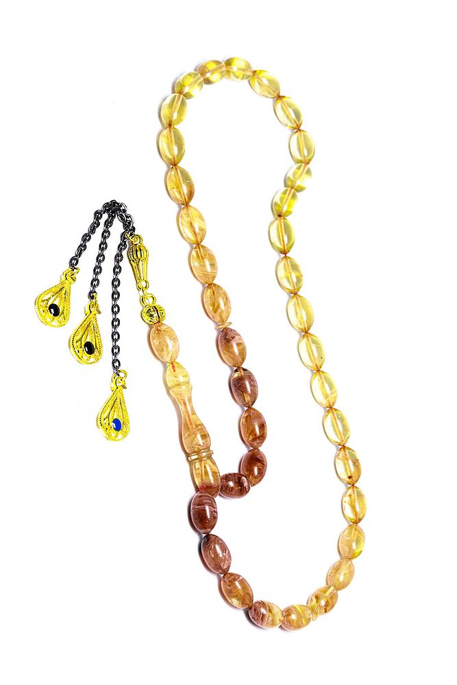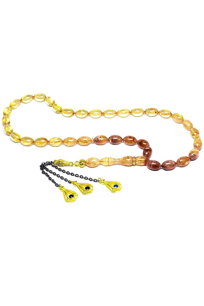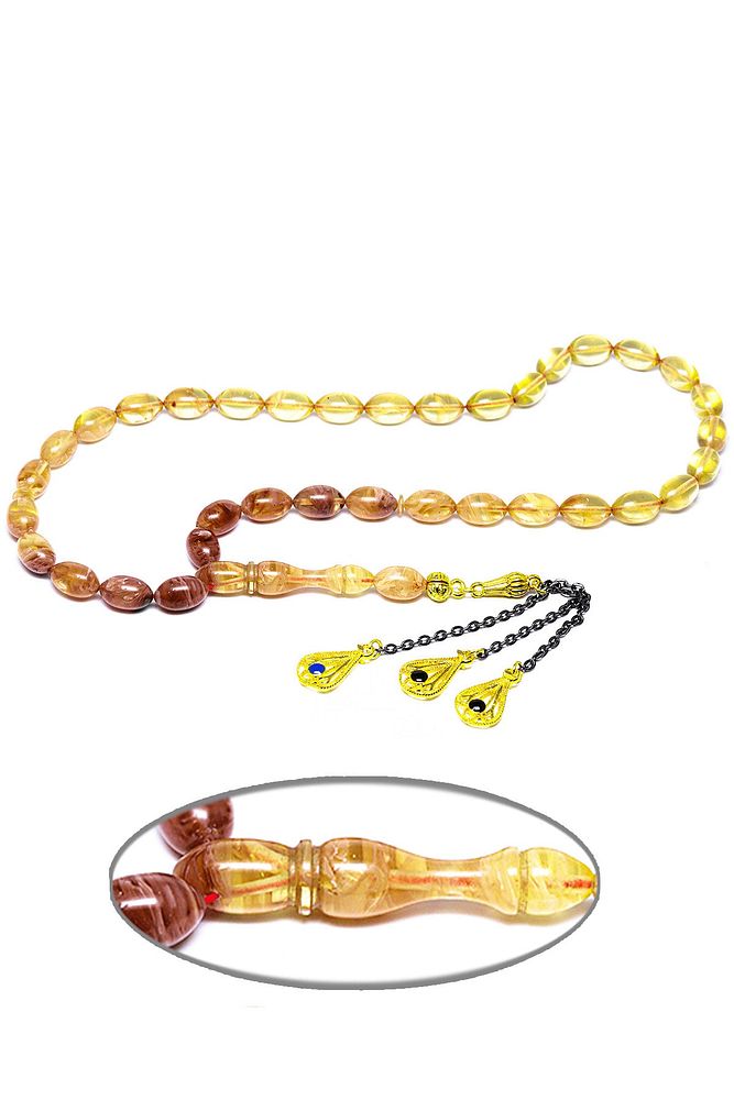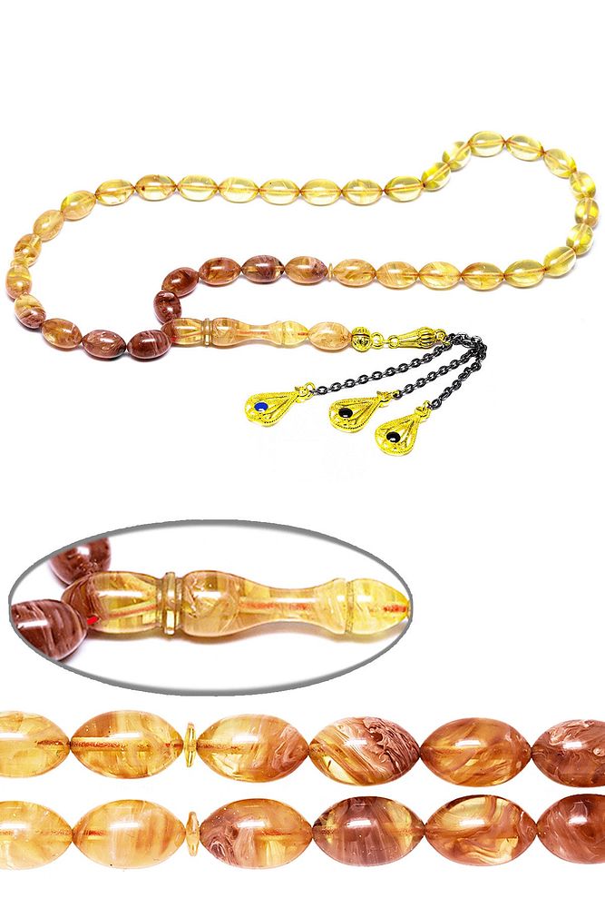 (Baş Ağrısı Sinir ve Stres) Tesbih Atölyesi, Sıkma kehribar tesbih, tasarımları özel olarak usta ellerde tasarlanır. Tasarımlarımız el yapımı olup sınırlı adette üretilmektedir. Tasarımlarda kullanılan püsküller düşük ayar gümüşten imal edilir. Tasarımlarda kullanılan kehribar taneleri hareli özel kalıplardan yapılır. Yapay reçine ile üretilmektedir. Ürünlerimiz renk almakta ve koku vermektedirler. Bu tasarımda; Kırmızı şeffaf renk geçişli özel 1.kalite sıkma kehribar reçine kullanılmıştır. Her kehribar tanesi birbirinin aynısı olmadığı için küçükte olsa farklılıklar gösterebilir. Üretildiği Malzeme; Sıkma Kehribar; Ana Renk; Sarı Renk; Ağırlık; 20-30 gr; Tane Şekli; 7x11 mm; Tane Ölçüsü; Beyzi Kesim; Toplam Uzunluk; 20-30 cm; İmame ve Püskül Maddesi; Düşük Ayar Gümüş;