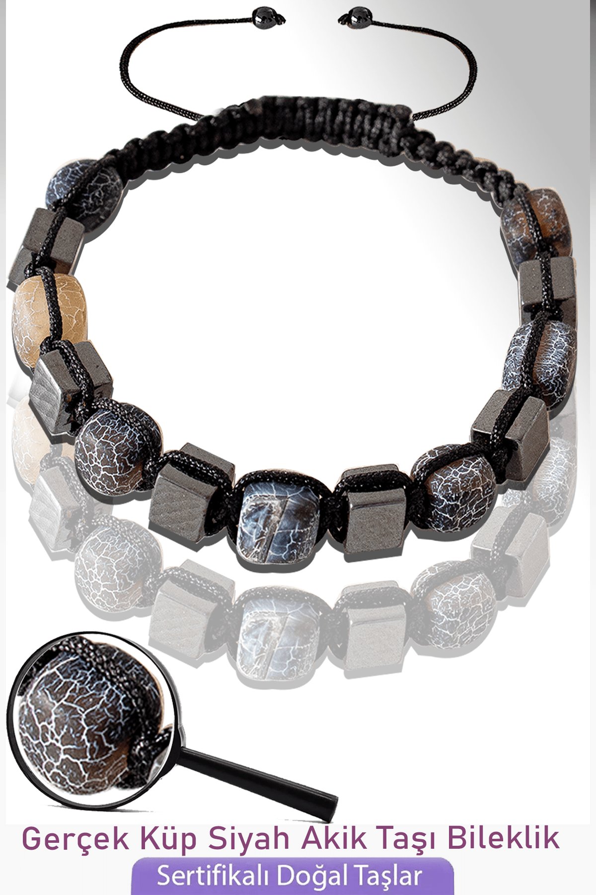 Sertifikalı Küp Model Gerçek Siyah Akik Taşı Bileklik - Ayarlamalı