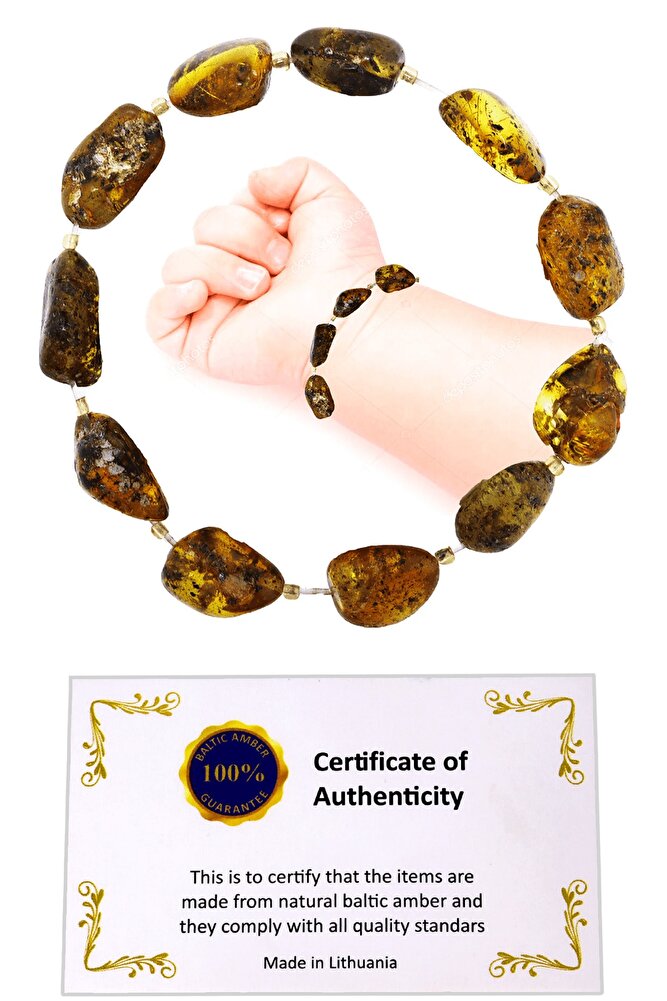 Sertifikalı Mat Toprak Yaprak Fosilli Doğal Damla Kehribar Bebek Bileklik