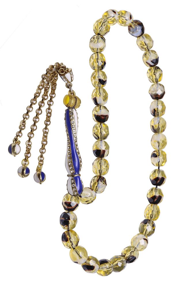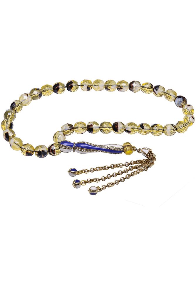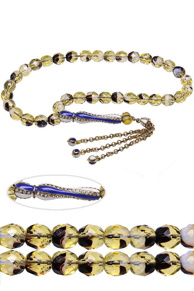Ürün ya da Doğal Taş Açıklaması (Para - Sağlık - Pozitif Enerji Taşı) Kuvars tesbih modelleri, \'\'Tesbih Atölyesi\'\' Atölyelerinde ustalarımız tarafından kuru torna işciliği ile elde özen ile tane tane işlenmektedir. Ürünlerimiz el işciliği olduğu için sınırlı sayıda üretilmektedir. Tasarımlarımızda kullandığımız taşlar Dünya\'nın en kaliteli doğal taşlarını kullanmaktayız. Tasarımlarımızda kullandığımız doğal taşların hiç biri birbirinin aynısı olmadığı için küçükte olsa farklılık gösterebilir. Doğal taşlar vücudunuza temas ettiği anda negatif enerjilerinizi alır ve pozitif enerjiler verir. Bu tasarımda; Sarı siyah renkli fasetli kuvars taşı ve Beyaz mavi mineli telkari altın kaplama imame ve püskül seti kullanılmıştır. Çift kaplama atıldığı için renk atmaz ve kararmaz bir yapıya sahiptir. Yedek ip ile gönderim sağlanır. Üretildiği Taş; Kuvars; Ana Renk; Doğal Renk; Ağırlık; 30-40 gr; Tane Şekli; 8x8 mm; Tane Ölçüsü; Küre Kesim; Toplam Uzunluk; 30-40 cm; İmame ve Püskül Maddesi; Düşük Ayar Gümüş;