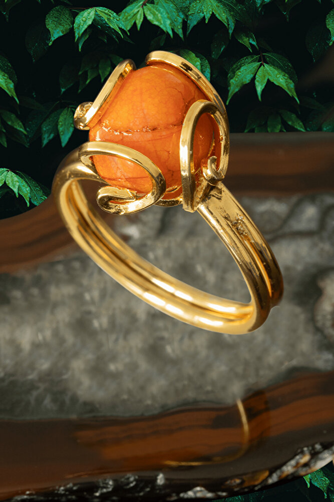 Sertifikalı Rokoko Model Altın Kaplama Turuncu Akik Taşı Yüzük - Ayarlamalı