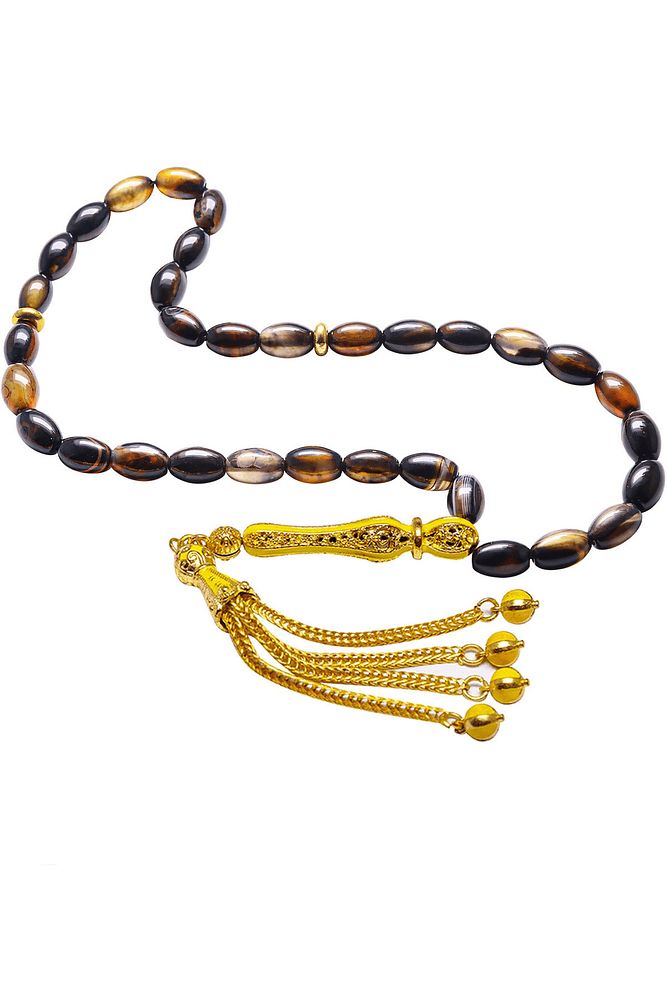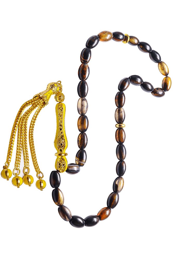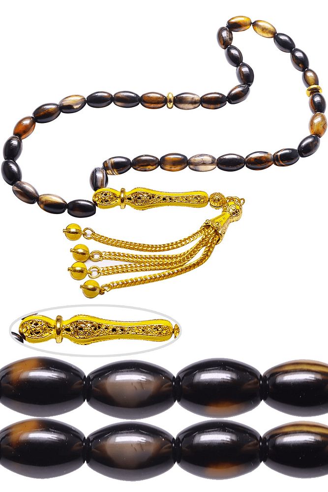 Ürün ya da Doğal Taş Açıklaması; ; (Para, Bereket ve Pozitif Enerji Taşı); ; Akik tesbih modelleri, \'\'Tesbih Atölyesi\'\' Atölyelerinde ustalarımız tarafından kuru torna işciliği ile elde özen ile tane tane işlenmektedir. Ürünlerimiz el işciliği olduğu için sınırlı sayıda üretilmektedir. Tasarımlarımızda kullandığımız taşlar Dünya\'nın en kaliteli akik taşlarını kullanmaktayız. Tasarımlarımızda kullandığımız doğal taşların hiç biri birbirinin aynısı olmadığı için küçükte olsa farklılık gösterebilir. Vücudunuza temas ettiği anda negatif enerjilerinizi alır ve pozitif enerjiler verir. Yedek ipi gönderilir ve ürünlerimiz \'\'Tesbih Atölyesi\'\' koruyucu ağaç kutusu ile gönderilmektedir. ; ; Bu tasarımda; Siyah ve kahverengi renkli özel damarlı akik taşı ve 24 ayar altın kaplama sarı mineli telkari imame ve püskül seti kullanılmıştır. Çift kaplama atıldığı için renk atmaz ve kararmaz bir yapıya sahiptir. ; Üretildiği Taş; Akik Taşı; Ana Renk; Doğal Renk; Ağırlık; 20-30 gr; Tane Şekli; 6x9 mm; Tane Ölçüsü; Beyzi Kesim; Toplam Uzunluk; 20-30cm; İmame ve Püskül Maddesi; Düşük Ayar Gümüş;
