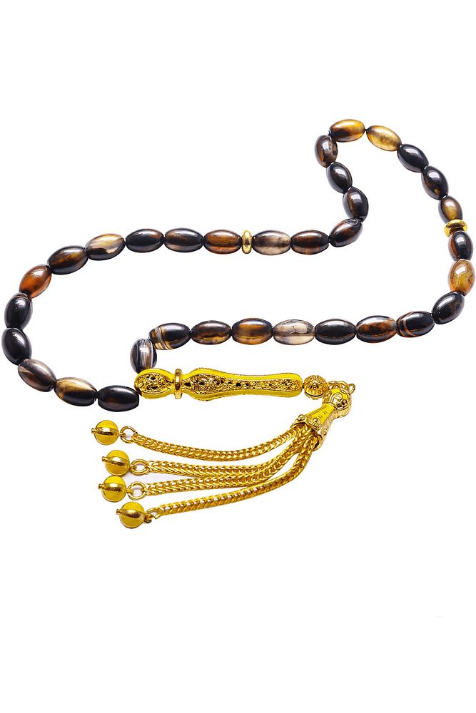 Sertifikalı Sarı Altın Kaplama Püsküllü Doğal Siyah Akik Taşı Tesbih