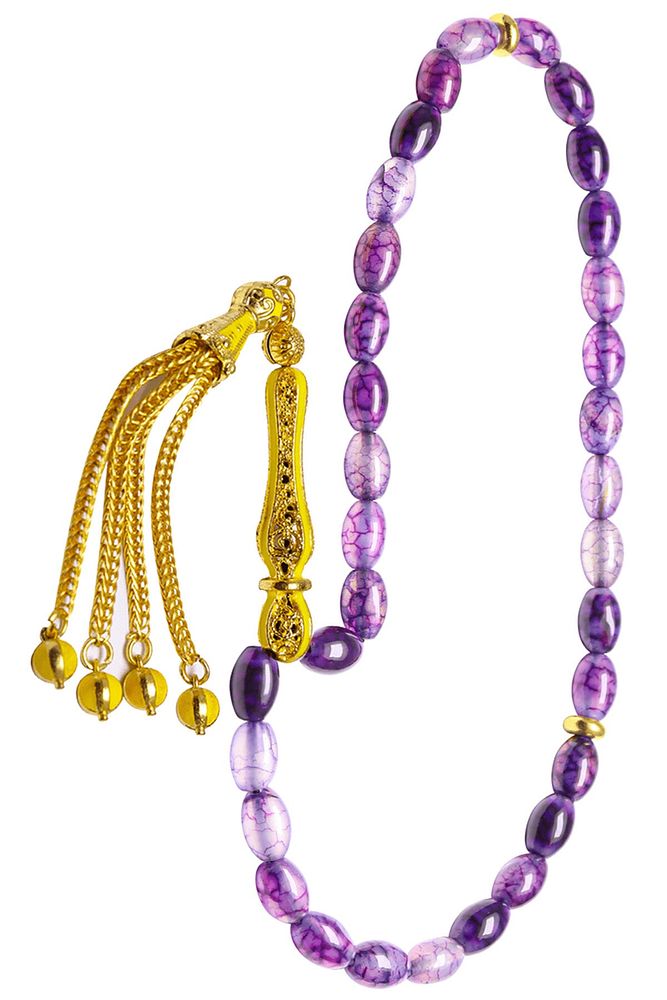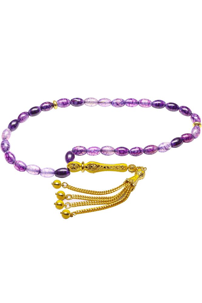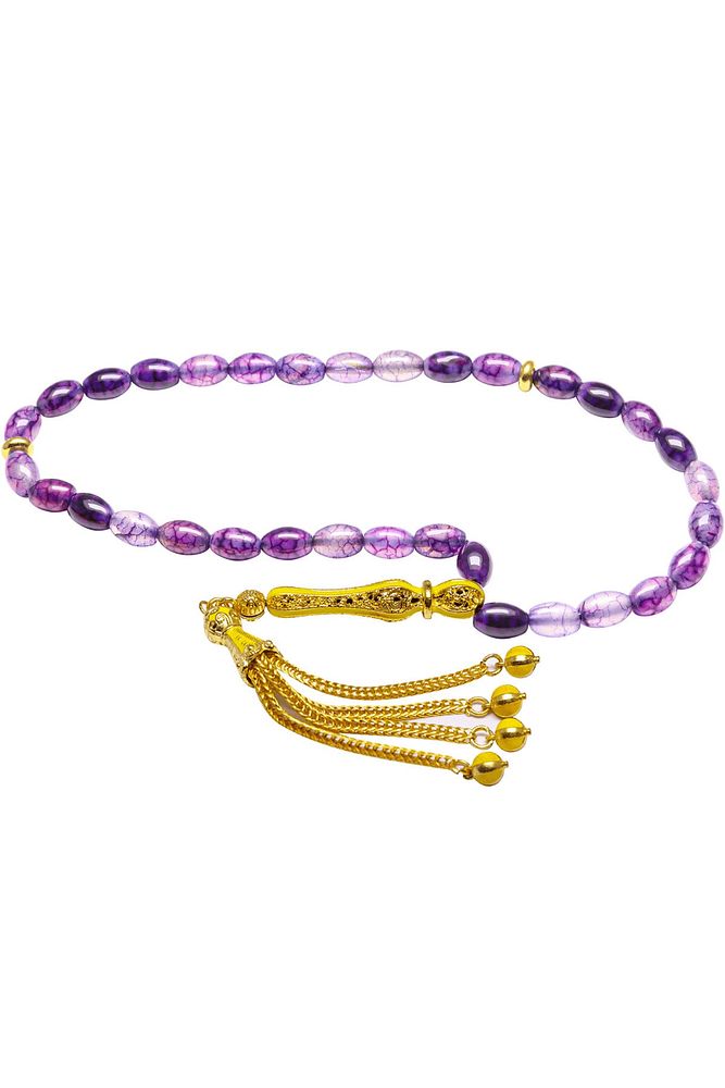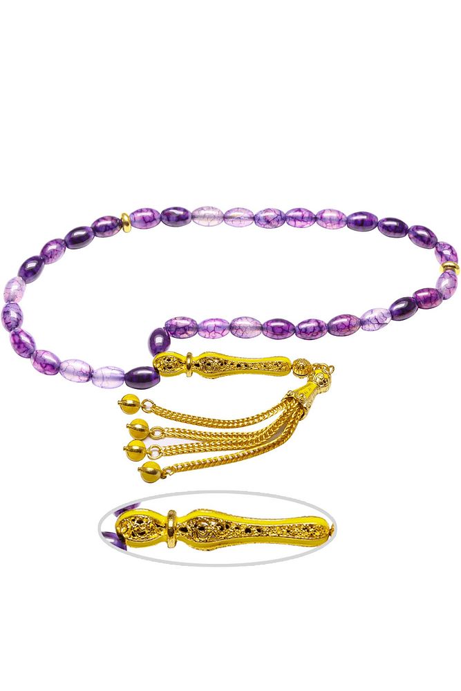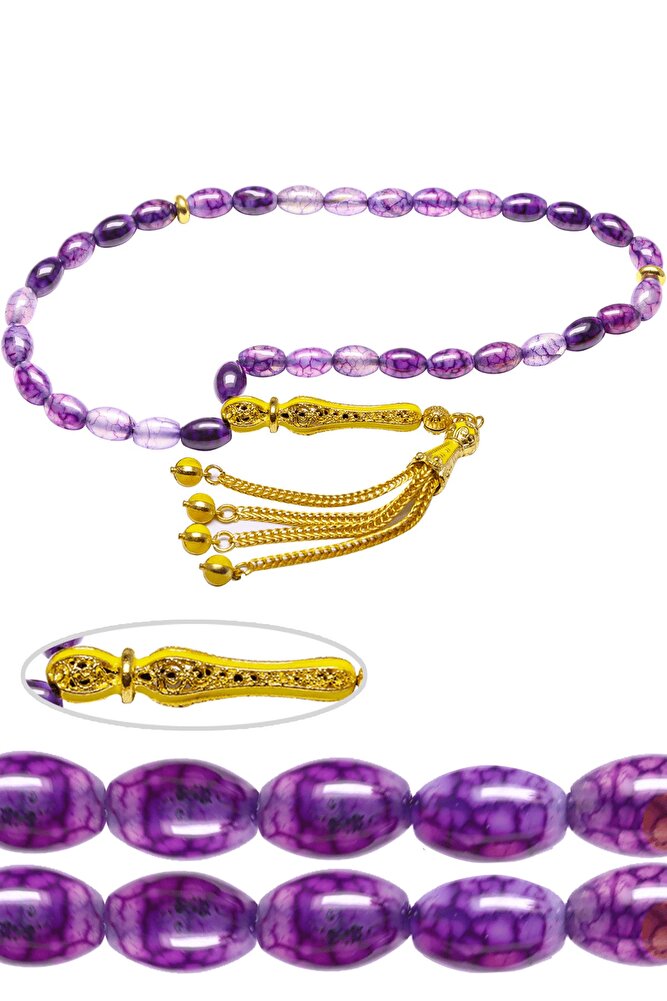 Ürün ya da Doğal Taş Açıklaması (Aşk ve Sevgi Taşı) Ametist tesbih modelleri, ''Tesbih Atölyesi'' Atölyelerinde ustalarımız tarafından kuru torna işciliği ile elde özen ile tane tane işlenmektedir. Ürünlerimiz el işciliği olduğu için sınırlı sayıda üretilmektedir. Tasarımlarımızda kullandığımız taşlar Dünya'nın en kaliteli ametist taşlarını kullanmaktayız. Tasarımlarımızda kullandığımız doğal taşların hiç biri birbirinin aynısı olmadığı için küçükte olsa farklılık gösterebilir. Vücudunuza temas ettiği anda sizleri gevşetir sinirinizi ve stresinizi alır. Pozitif enerjiler verir. Yedek ipi gönderilir ve ürünlerimiz ''Tesbih Atölyesi'' koruyucu ağaç kutusu ile gönderilmektedir. Bu tasarımın yapımında; Damarlı doğal beyzi kesim ametist taşı kullanılmıştır. İmame ve püskül tasarımında; Sarı turkuaz mineli altın kaplama telkari imame ve püskül seti kullanılmıştır. Çift kaplama atıldığı için renk atmaz ve kararmaz bir yapıya sahiptir. Üretildiği Taş; Ametist Taşı; Ana Renk; Doğal Renk; Ağırlık; 20-30 gr; Tane Şekli; 6x9 mm; Tane Ölçüsü; Beyzi Kesim; Toplam Uzunluk; 20-30 cm; İmame ve Püskül Maddesi; Düşük Ayar Gümüş;