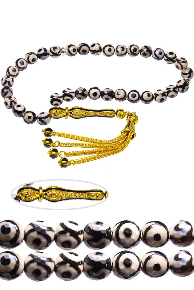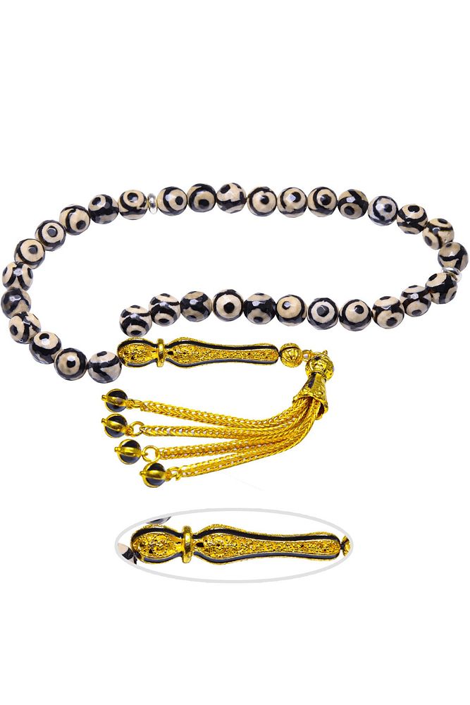 Ürün ya da Doğal Taş Açıklaması (Para, Bereket ve Pozitif Enerji Taşı) Akik tesbih modelleri, \'\'Tesbih Atölyesi\'\' Atölyelerinde ustalarımız tarafından kuru torna işciliği ile elde özen ile tane tane işlenmektedir. Ürünlerimiz el işciliği olduğu için sınırlı sayıda üretilmektedir. Tasarımlarımızda kullandığımız taşlar Dünya\'nın en kaliteli akik taşlarını kullanmaktayız. Tasarımlarımızda kullandığımız doğal taşların hiç biri birbirinin aynısı olmadığı için küçükte olsa farklılık gösterebilir. Vücudunuza temas ettiği anda negatif enerjilerinizi alır ve pozitif enerjiler verir. Yedek ipi gönderilir ve ürünlerimiz \'\'Tesbih Atölyesi\'\' koruyucu ağaç kutusu ile gönderilmektedir. Bu tasarımda; Siyah benekli doğal tibet akik taşı ve altın kaplama siyah mineli telkari imame ve püskül seti kullanılmıştır. Çift kaplama atılıdığı için renk atmaz ve kararmaz bir yapıya sahiptir. Üretildiği Taş; Akik Taşı; Ana Renk; Doğal Renk; Ağırlık; 20-30 gr; Tane Şekli; 8x8 mm; Tane Ölçüsü; Küre Kesim; Toplam Uzunluk; 20-30cm; İmame ve Püskül Maddesi; Düşük Ayar Gümüş;