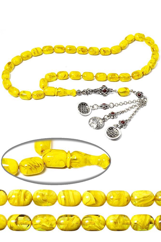 Ürün ya da Doğal Taş Açıklaması; ; (Baş Ağrısı Sinir ve Stres); ; Tesbih Atölyesi, Sıkma kehribar tesbih, tasarımları özel olarak usta ellerde tasarlanır. Tasarımlarımız el yapımı olup sınırlı adette üretilmektedir. Tasarımlarda kullanılan püsküller düşük ayar gümüşten imal edilir. Tasarımlarda kullanılan kehribar taneleri hareli özel kalıplardan yapılır. Yapay reçine ile üretilmektedir. Ürünlerimiz renk almakta ve koku vermektedirler. ; ; Bu tasarımda; Sarı renkli özel yoğun hareli 1.kalite sıkma kehribar reçine kullanılmıştır. Her kehribar tanesi birbirinin aynısı olmadığı için küçükte olsa farklılıklar gösterebilir.; ; Üretildiği Malzeme; Sıkma Kehribar; Ana Renk; Sarı Renk; Ağırlık; 20-30 gr; Tane Şekli; 8x11.5 mm; Tane Ölçüsü; Kapsül Kesim; Toplam Uzunluk; 20-30 cm; İmame ve Püskül Maddesi; Düşük Ayar Gümüş;