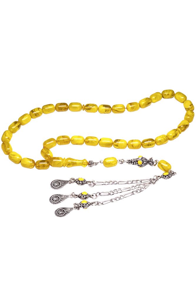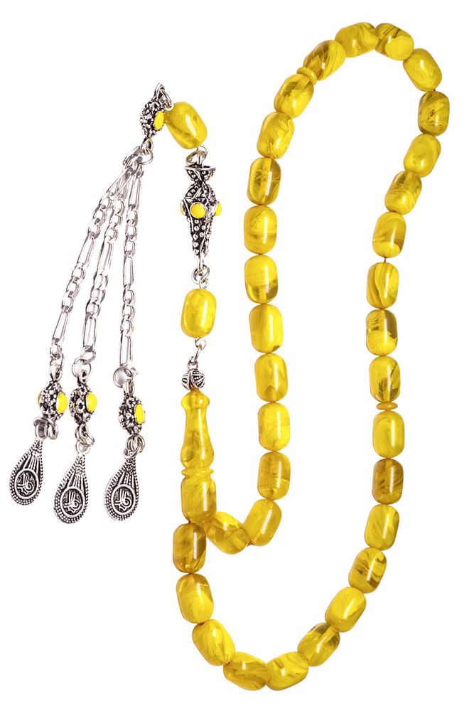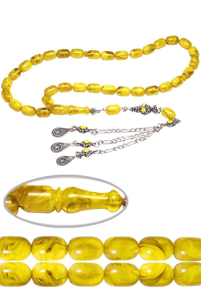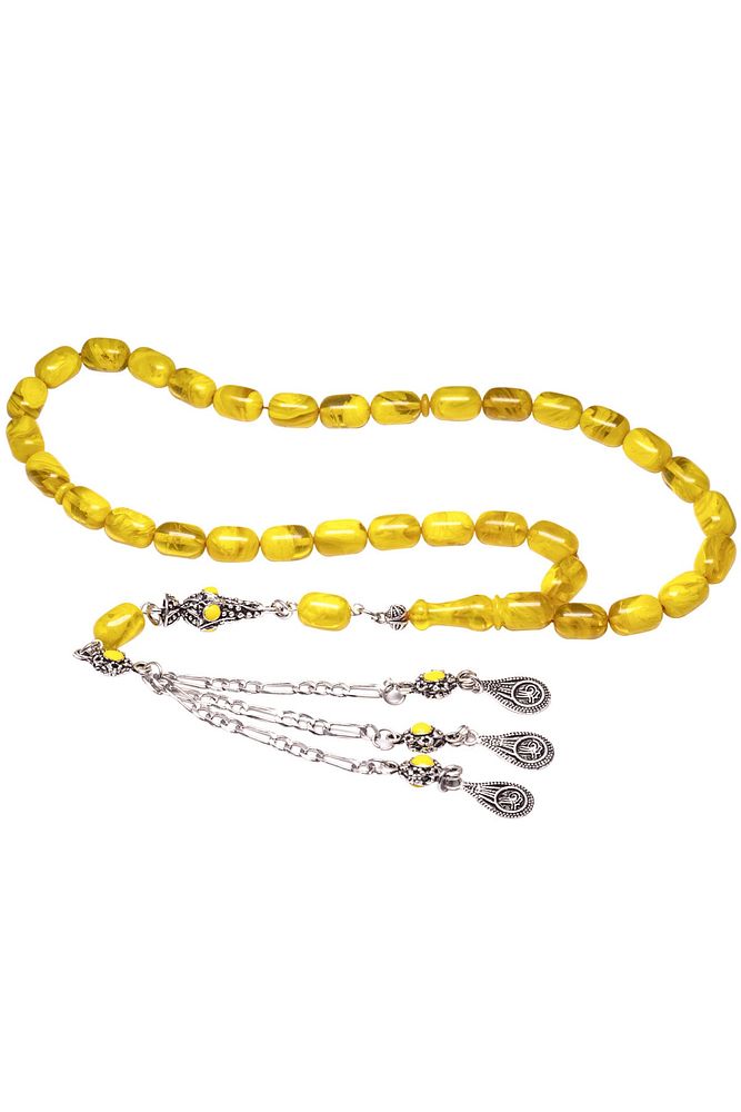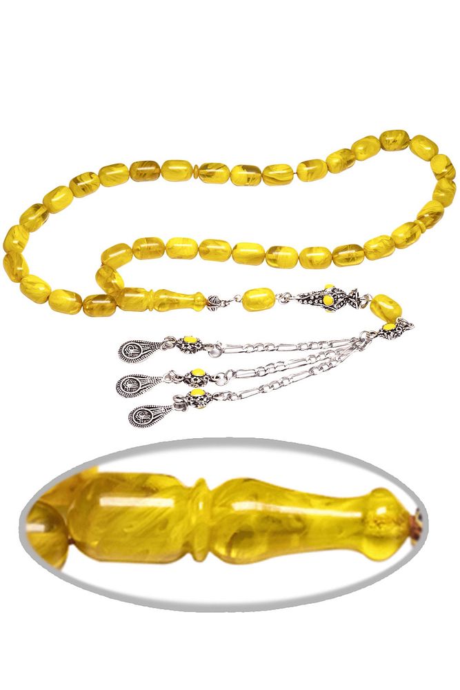 Sertifikalı Sarı Renk Hareli Halep Püskül Sıkma Kehribar Tesbih