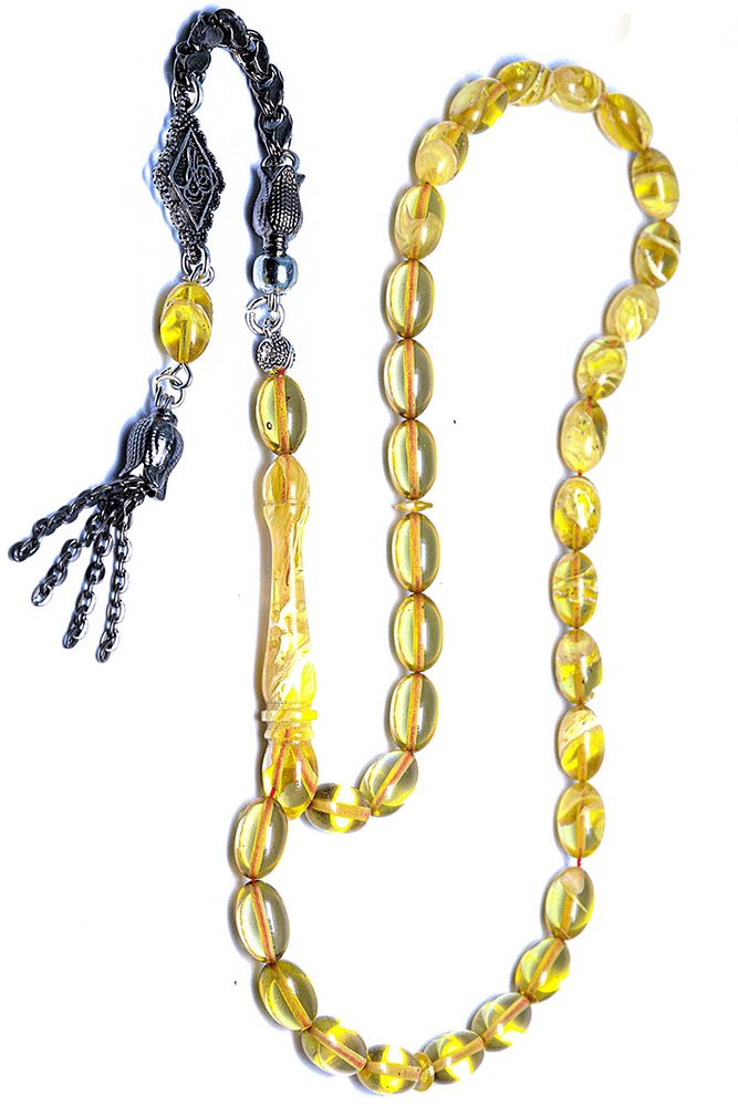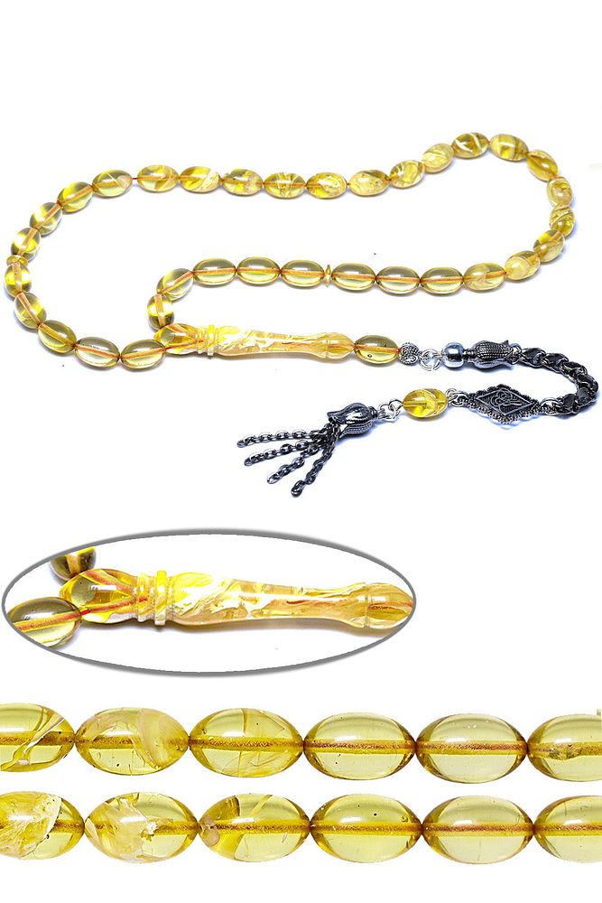 Ürün ya da Doğal Taş Açıklaması; ; (Baş Ağrısı Sinir ve Stres); ; Tesbih Atölyesi, Sıkma kehribar tesbih, tasarımları özel olarak usta ellerde tasarlanır. Tasarımlarımız el yapımı olup sınırlı adette üretilmektedir. Tasarımlarda kullanılan püsküller düşük ayar gümüşten imal edilir. Tasarımlarda kullanılan kehribar taneleri hareli özel kalıplardan yapılır. Yapay reçine ile üretilmektedir. Ürünlerimiz renk almakta ve koku vermektedirler. ; ; Bu tasarımda; Yoğun sarı şeffaf renk hüzmesi 1.kalite sıkma kehribar reçine kullanılmıştır. Her kehribar tanesi birbirinin aynısı olmadığı için küçükte olsa farklılıklar gösterebilir.; ; Üretildiği Malzeme; Sıkma Kehribar; Ana Renk; Sarı Renk; Ağırlık; 20-30 gr; Tane Şekli; 7x11 mm; Tane Ölçüsü; Beyzi Kesim; Toplam Uzunluk; 20-30 cm; İmame ve Püskül Maddesi; Düşük Ayar Gümüş;