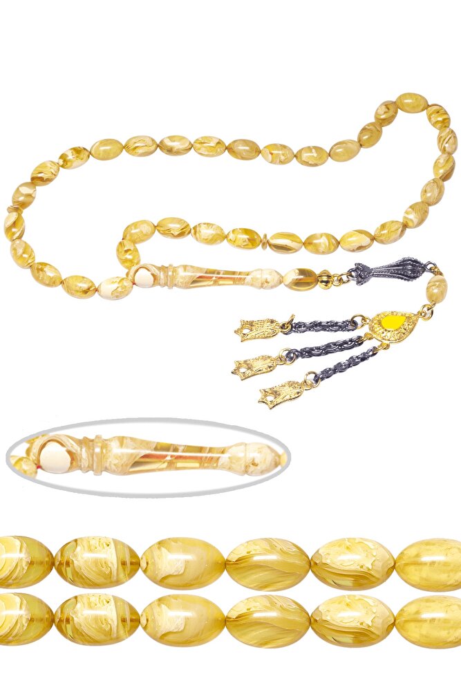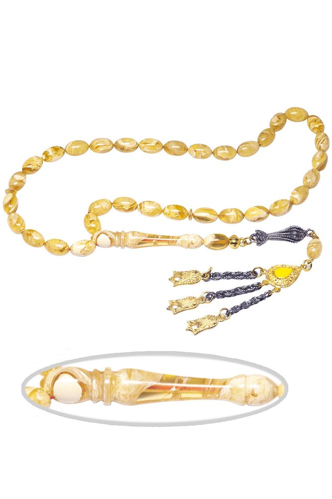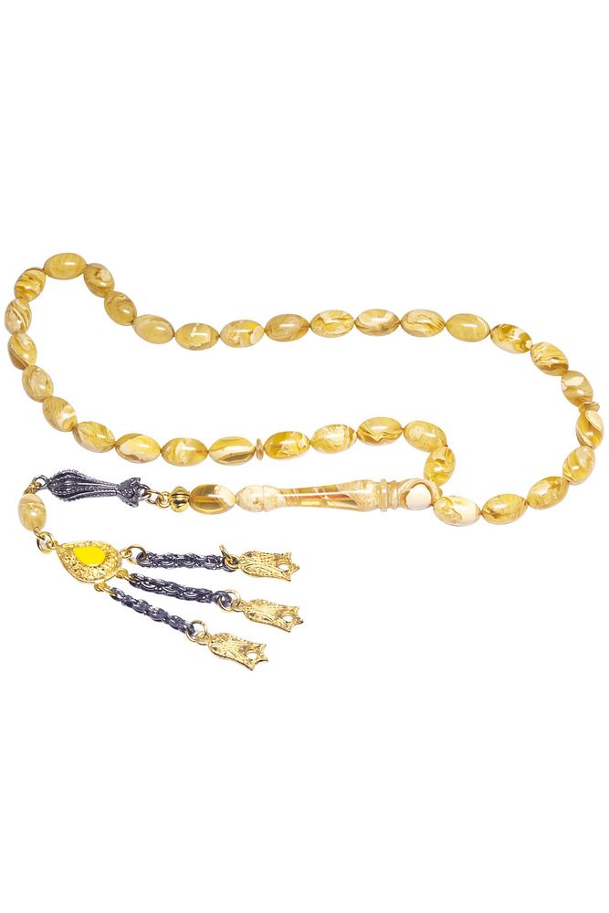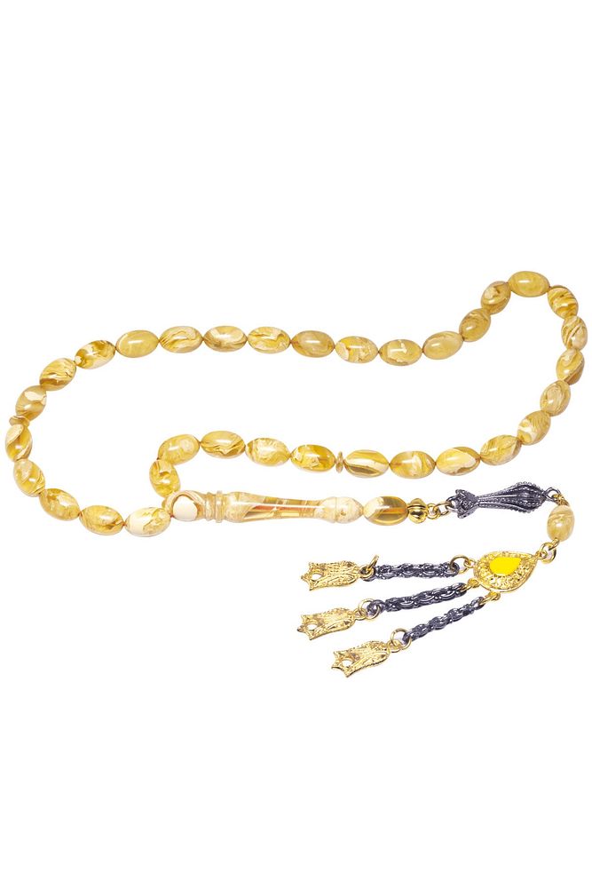 Sertifikalı Sarı Renkli Beyzi Kesim Hareli Sıkma Kehribar Tesbih