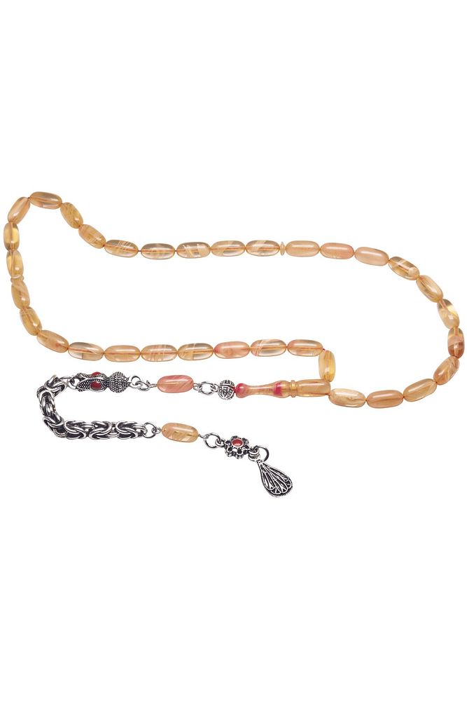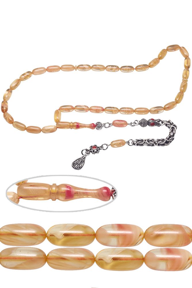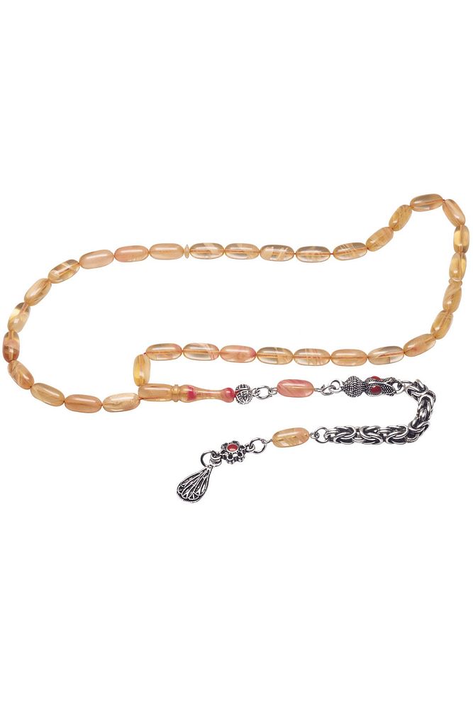 (Baş Ağrısı Sinir ve Stres) Tesbih Atölyesi, Sıkma kehribar tesbih, tasarımları özel olarak usta ellerde tasarlanır. Tasarımlarımız el yapımı olup sınırlı adette üretilmektedir. Tasarımlarda kullanılan püsküller düşük ayar gümüşten imal edilir. Tasarımlarda kullanılan kehribar taneleri hareli özel kalıplardan yapılır. Yapay reçine ile üretilmektedir. Ürünlerimiz renk almakta ve koku vermektedirler. Bu tasarımda; Sarı renkli özel ve muhteşem renk alan kaliteli çubuk sıkma kehribar reçine kullanılmıştır. Her kehribar tanesi birbirinin aynısı olmadığı için küçükte olsa farklılıklar gösterebilir. Üretildiği Malzeme; Sıkma Kehribar; Ana Renk; Sarı Renk; Ağırlık; 20-30 gr; Tane Şekli; 5.5x11 mm; Tane Ölçüsü; Kapsül Kesim; Toplam Uzunluk; 20-30 cm; İmame ve Püskül Maddesi; Düşük Ayar Gümüş;