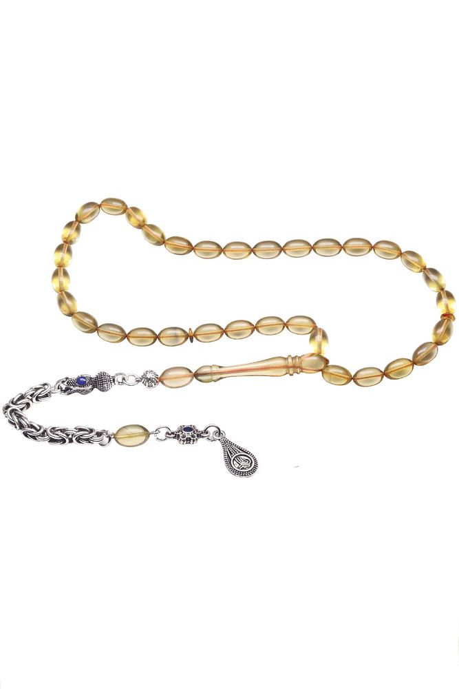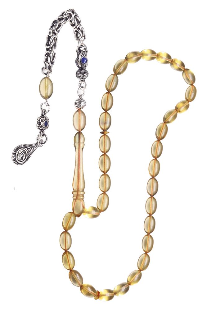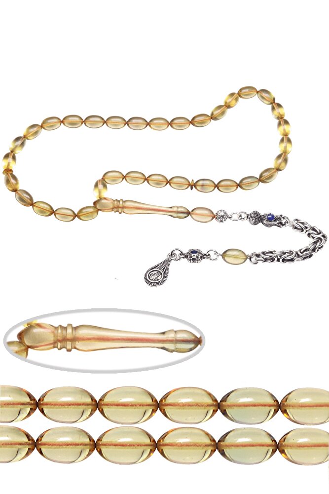 (Ağrı Kesici, Sinir Stres ve Bereket Taşı) Ateş kehribar tesbih modelleri, ''Tesbih Atölyesi'' Atölyelerinde ustalarımız tarafından kuru torna işciliği ile elde özen ile tane tane işlenmektedir. Ürünlerimiz el işciliği olduğu için sınırlı sayıda üretilmektedir. Tasarımlarımızda kullandığımız reçineler Dünya'nın en kaliteli reçineleridir. Kısa bir süre içerisinde renk alır ve koku verir. Ürünleriniz orijinallik ve garanti belgesi ile gönderilir. Tasarımlarımıza üç kat cila atılmıştır. Muhteşem bir çekime sahip koleksiyonluk ve günlük çekim için ideal ürünlerdir. Bu tasarımda; Şeffaf bal sarısı renkli şeffaf delim renk alan ve koku veren kaliteli ateş kehribar reçine kullanılmıştır. Her kehribar tanesi birbirinin aynısı olmadığı için küçükte olsa farklılıklar gösterebilir. Üretildiği Malzeme ; Ateş Kehribar ; Ana Renk ; Şeffaf Renk ; Ağırlık ; 20-30 gr ; Tane Şekli ; 7x11 mm ; Tane Ölçüsü ; Beyzi Kesim ; Toplam Uzunluk ; 20-30 cm ; İmame ve Püskül Maddesi ; Düşük Ayar Gümüş ;