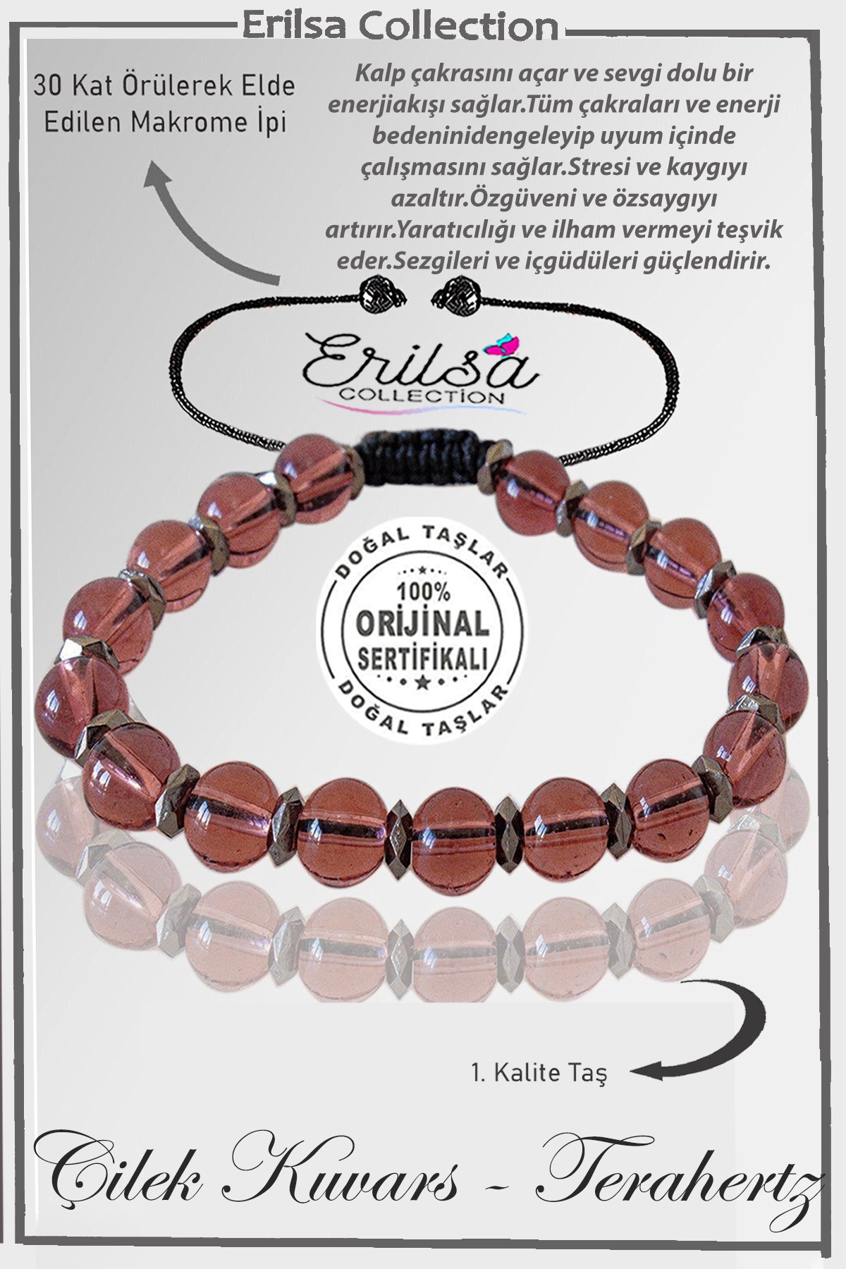 Sertifikalı Silver Fasetli Hematit - Çilek Kuvars Taşı Bileklik - Ayarlamalı