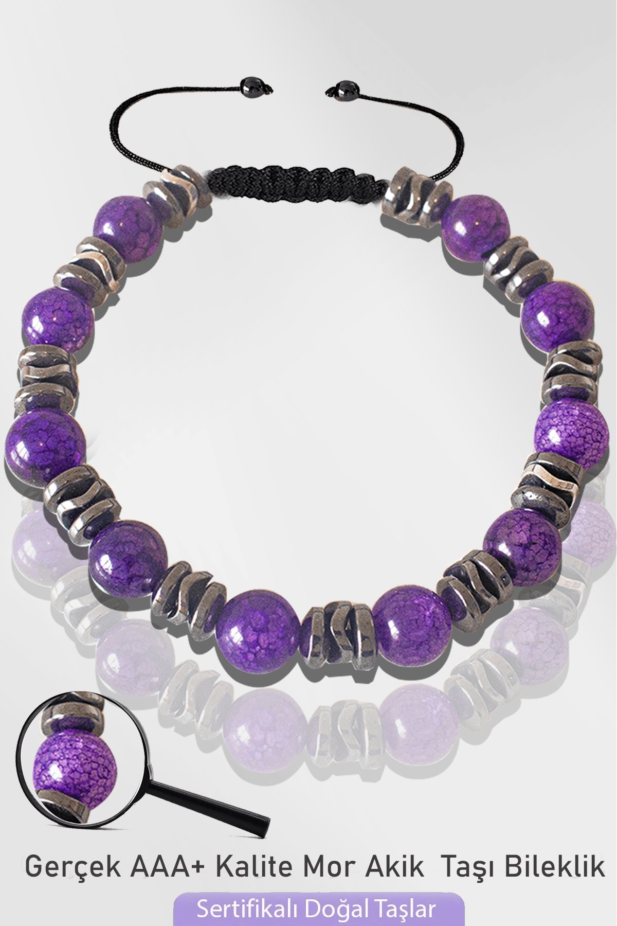 Sertifikalı Silver Hematitli Doğal Damarlı Mor Akik Taşı Bileklik - Ayarlamalı