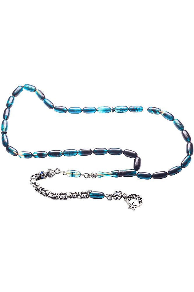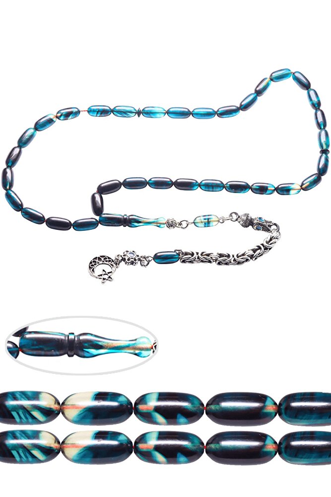 Ürün ya da Doğal Taş Açıklaması (Baş Ağrısı Sinir ve Stres) Tesbih Atölyesi, Sıkma kehribar tesbih, tasarımları özel olarak usta ellerde tasarlanır. Tasarımlarımız el yapımı olup sınırlı adette üretilmektedir. Tasarımlarda kullanılan püsküller düşük ayar gümüşten imal edilir. Tasarımlarda kullanılan kehribar taneleri hareli özel kalıplardan yapılır. Yapay reçine ile üretilmektedir. Ürünlerimiz renk almakta ve koku vermektedirler. Bu tasarımda; Siyah ve mavi renkli özel hareli renk alan kaliteli sıkma kehribar reçine kullanılmıştır. Her kehribar tanesi birbirinin aynısı olmadığı için küçükte olsa farklılıklar gösterebilir. Üretildiği Malzeme; Sıkma Kehribar; Ana Renk; Siyah ve Mavi Renk; Ağırlık; 20-30 gr; Tane Şekli; 5.5x11 mm; Tane Ölçüsü; Aspirin Kapsül Kesim; Toplam Uzunluk; 20-30 cm; İmame ve Püskül Maddesi; Düşük Ayar Gümüş;