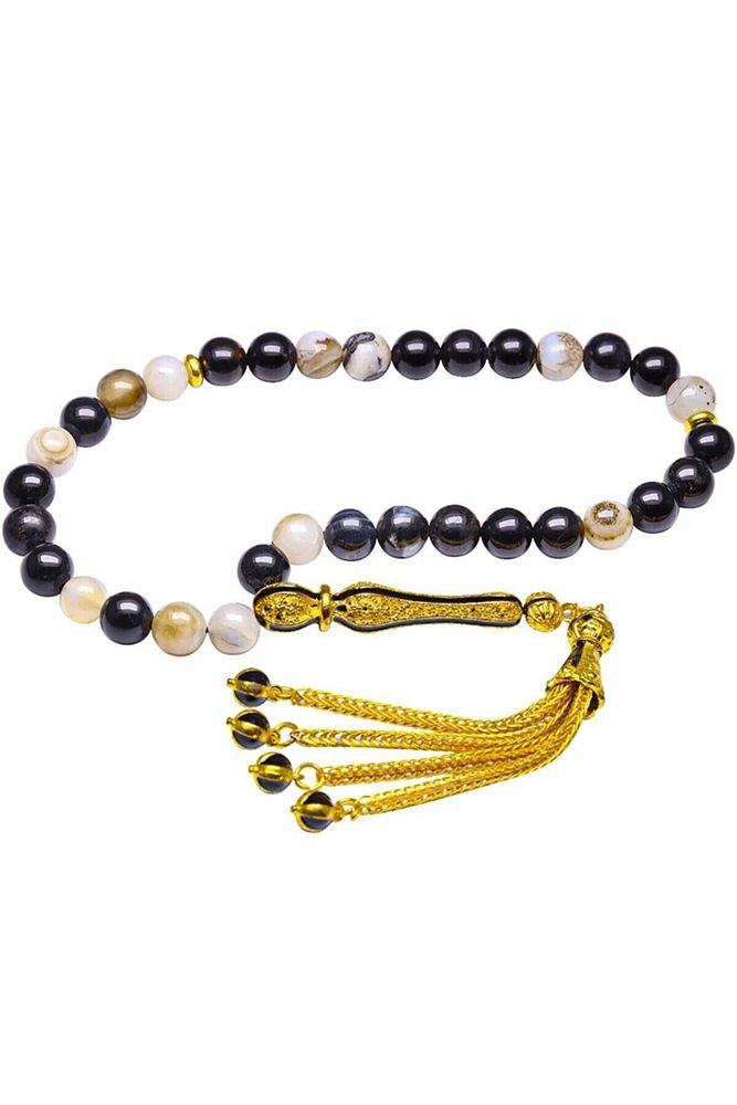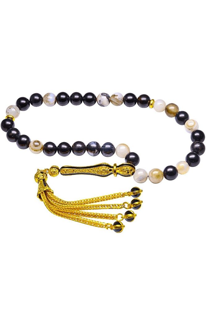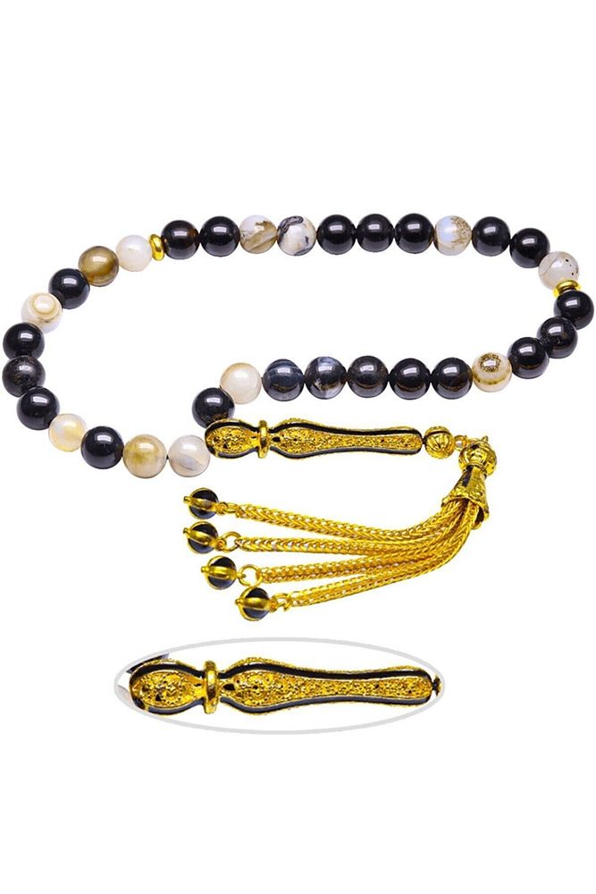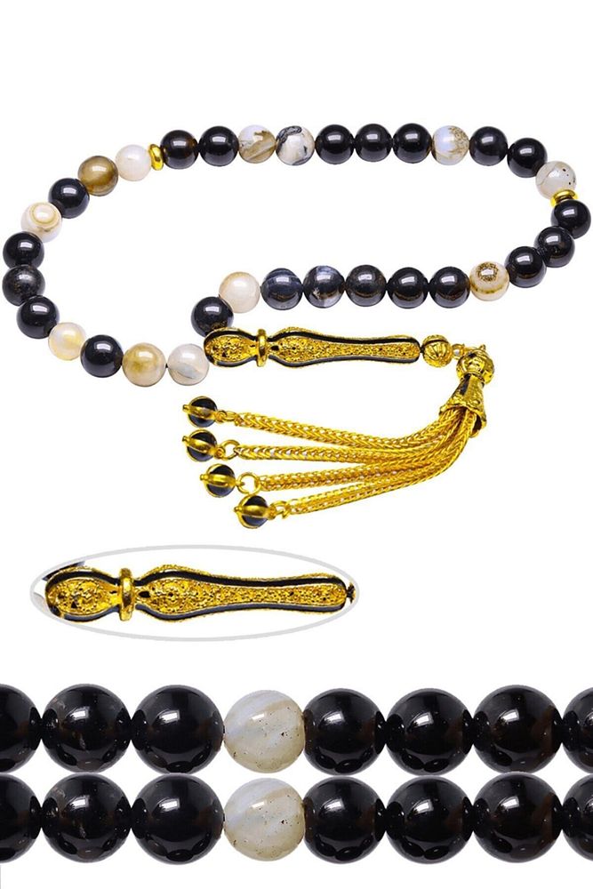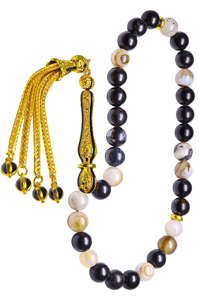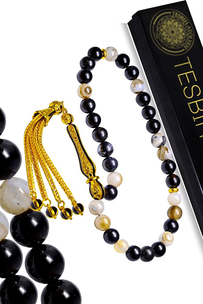 (Para, Bereket ve Pozitif Enerji Taşı); Akik tesbih modelleri, \'\'Tesbih Atölyesi\'\' Atölyelerinde ustalarımız tarafından kuru torna işciliği ile elde özen ile tane tane işlenmektedir. Ürünlerimiz el işciliği olduğu için sınırlı sayıda üretilmektedir. Tasarımlarımızda kullandığımız taşlar Dünya\'nın en kaliteli akik taşlarını kullanmaktayız. Tasarımlarımızda kullandığımız doğal taşların hiç biri birbirinin aynısı olmadığı için küçükte olsa farklılık gösterebilir. Vücudunuza temas ettiği anda negatif enerjilerinizi alır ve pozitif enerjiler verir. Yedek ipi gönderilir ve ürünlerimiz \'\'Tesbih Atölyesi\'\' koruyucu ağaç kutusu ile gönderilmektedir. ; Bu tasarımın yapımında; Siyah beyaz renkli %100 doğal akik taşı kullanılmıştır. İmame ve püskül tasarımında; Sarı syiah mineli altın kaplama telkari imame ve püskül seti kullanılmıştır. Çift kaplama atıldığı için renk atmaz ve kararmaz bir yapıya sahiptir. ; Üretildiği Taş; Siyah Beyaz Akik Taşı; Ana Renk; Doğal Renk; Ağırlık; 20-30 gr; Tane Şekli; 8x8 mm; Tane Ölçüsü; Küre Kesim; Toplam Uzunluk; 20-30 cm; İmame ve Püskül Maddesi; Düşük Ayar Gümüş;
