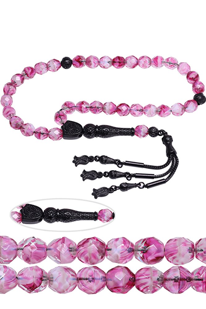 Sertifikalı Siyah Nikel Püsküllü Fasetli Pembe Kuvars Taşı Tesbih