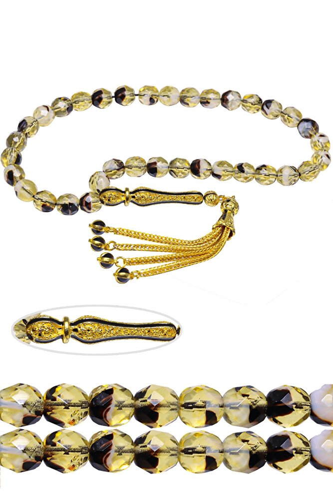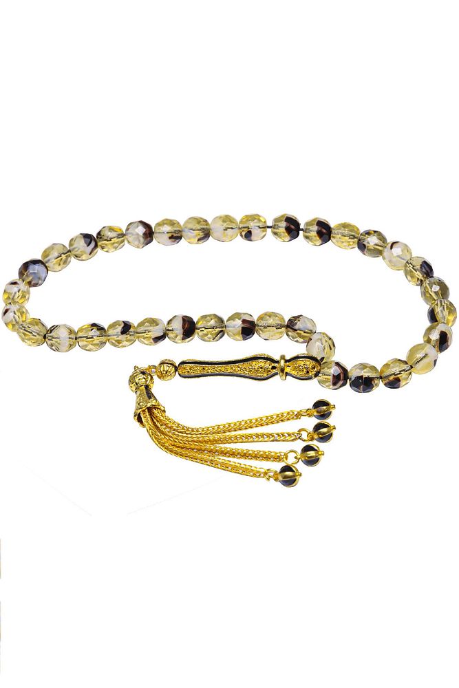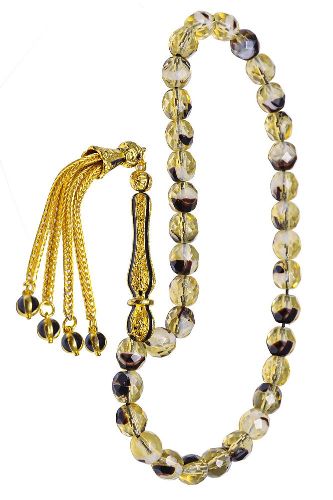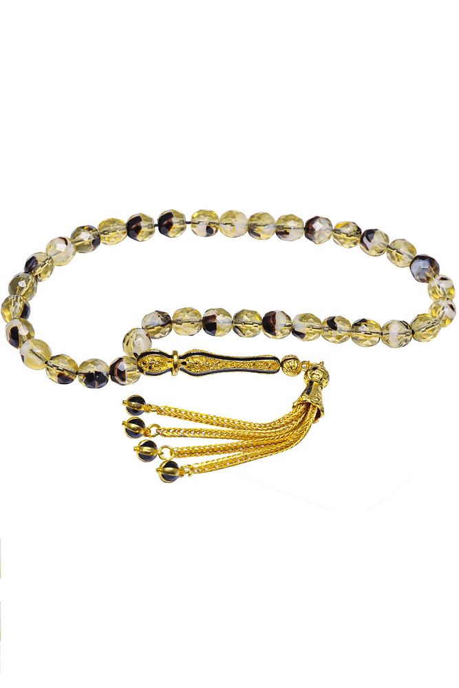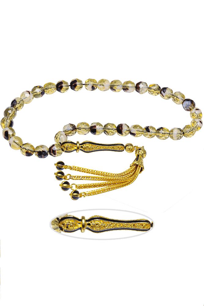 Sertifikalı Siyah Sarı Renkli Altın Kaplama Telkari Püskül Doğal Kuvars Taşı Tesbih