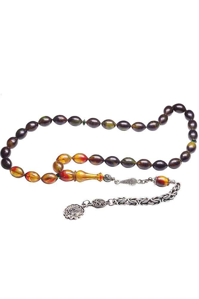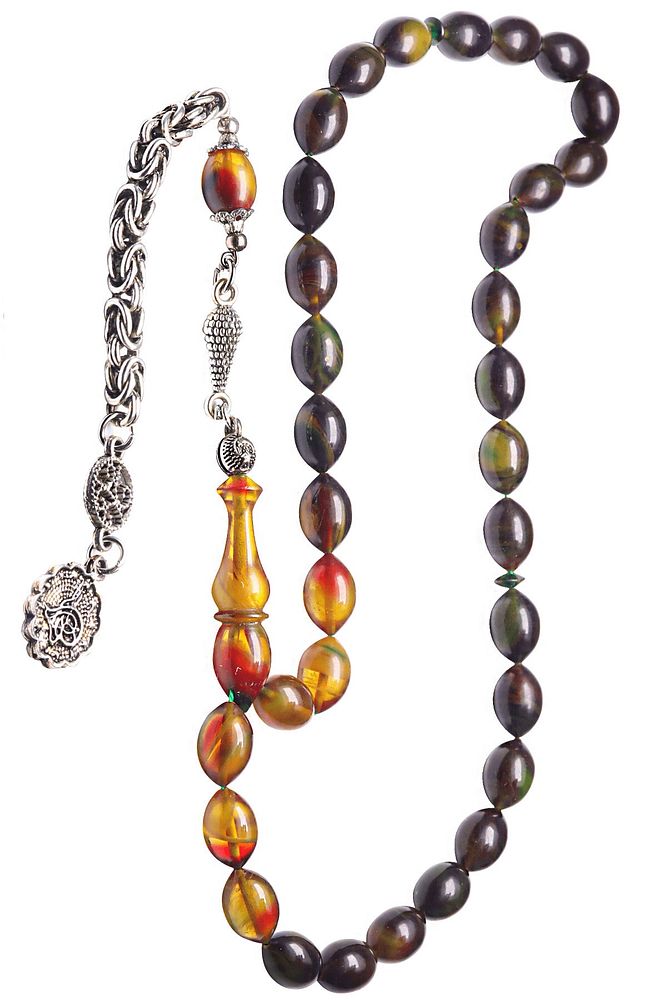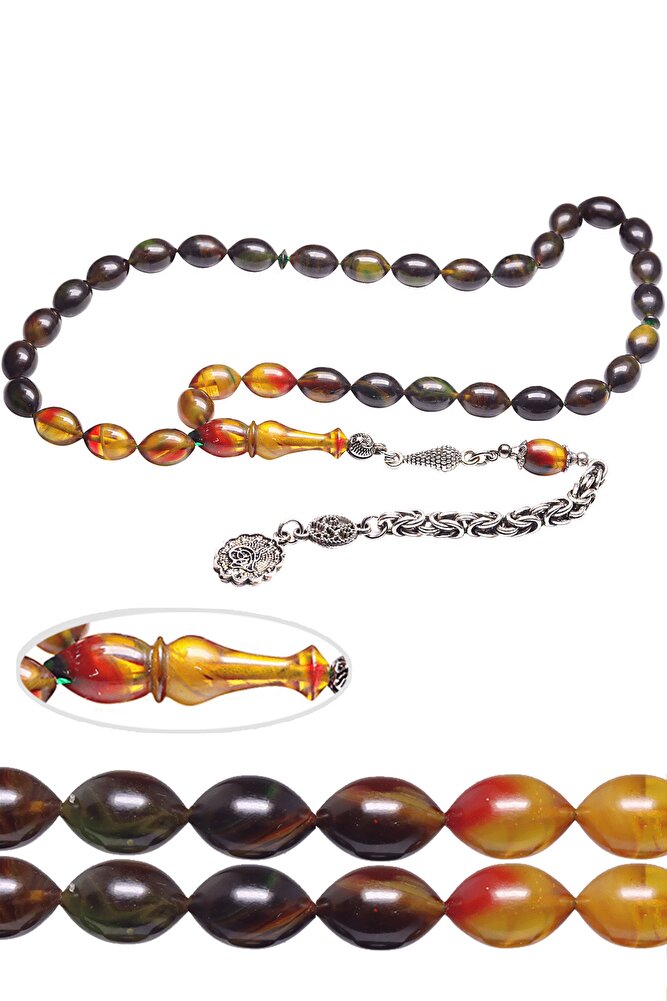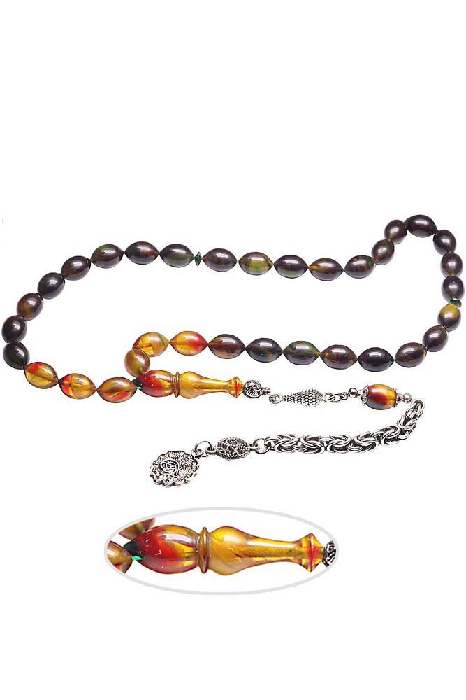 Ürün ya da Doğal Taş Açıklaması (Baş Ağrısı Sinir ve Stres) Tesbih Atölyesi, Sıkma kehribar tesbih, tasarımları özel olarak usta ellerde tasarlanır. Tasarımlarımız el yapımı olup sınırlı adette üretilmektedir. Tasarımlarda kullanılan püsküller düşük ayar gümüşten imal edilir. Tasarımlarda kullanılan kehribar taneleri hareli özel kalıplardan yapılır. Yapay reçine ile üretilmektedir. Ürünlerimiz renk almakta ve koku vermektedirler. Bu tasarımda; Siyah ve sarı renkli hareli özel renk alan kaliteli sıkma kehribar reçine kullanılmıştır. Her kehribar tanesi birbirinin aynısı olmadığı için küçükte olsa farklılıklar gösterebilir. Üretildiği Malzeme; Sıkma Kehribar; Ana Renk; Siyah ve Sarı Renk; Ağırlık; 20-30 gr; Tane Şekli; 8x11 mm; Tane Ölçüsü; Beyzi Kesim; Toplam Uzunluk; 20-30 cm; İmame ve Püskül Maddesi; Düşük Ayar Gümüş;