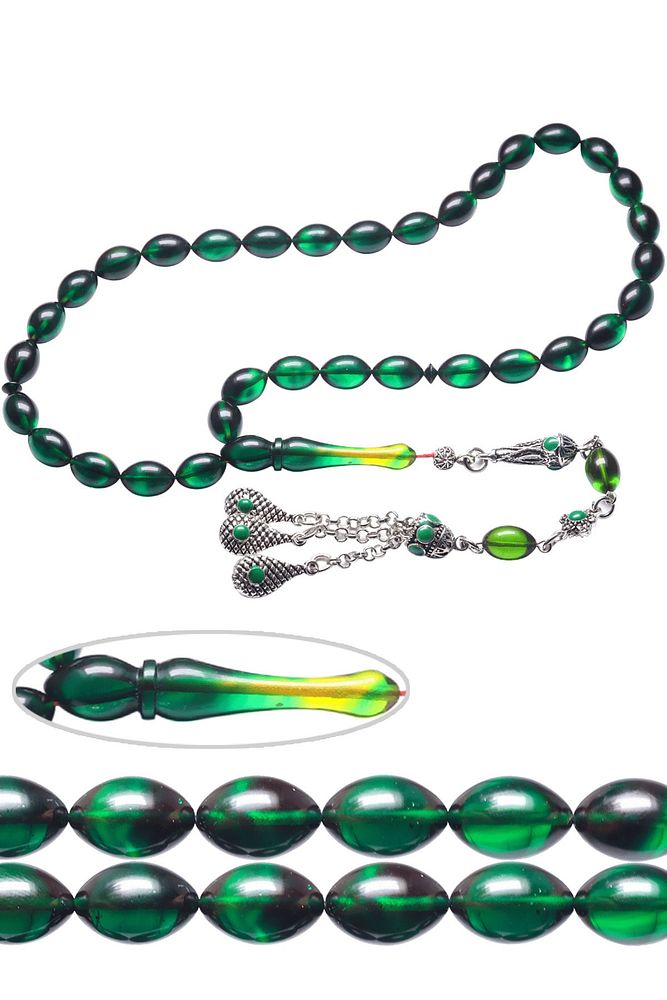 (Ağrı Kesici, Sinir Stres ve Bereket Taşı); ; Ateş kehribar tesbih modelleri, \'\'Tesbih Atölyesi\'\' Atölyelerinde ustalarımız tarafından kuru torna işciliği ile elde özen ile tane tane işlenmektedir. Ürünlerimiz el işciliği olduğu için sınırlı sayıda üretilmektedir. Tasarımlarımızda kullandığımız reçineler Dünya\'nın en kaliteli reçineleridir. Kısa bir süre içerisinde renk alır ve koku verir. Ürünleriniz orijinallik ve garanti belgesi ile gönderilir. Tasarımlarımıza üç kat cila atılmıştır. Muhteşem bir çekime sahip koleksiyonluk ve günlük çekim için ideal ürünlerdir.; ; Bu tasarımda; Yeşil ve siyah renkli özel yoğun hareli kaliteli ve orijinal renk alan ve koku veren kaliteli ateş kehribar reçine kullanılmıştır. Her kehribar tanesi birbirinin aynısı olmadığı için küçükte olsa farklılıklar gösterebilir.; Üretildiği Malzeme; Ateş Kehribar; Ana Renk; Yeşil ve Siyah Renk; Ağırlık; 20-30 gr; Tane Şekli; 7x11 mm; Tane Ölçüsü; Beyzi Kesim; Toplam Uzunluk; 20-30 cm; İmame ve Püskül Maddesi; Düşük Ayar Gümüş;