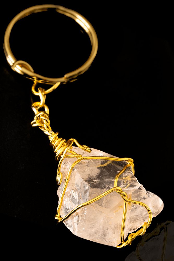 Sertifikalı Tel Sargılı Ham Kristal Kuvars Taşı Anahtarlık - Altın Kaplama