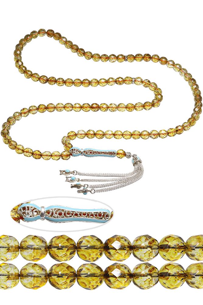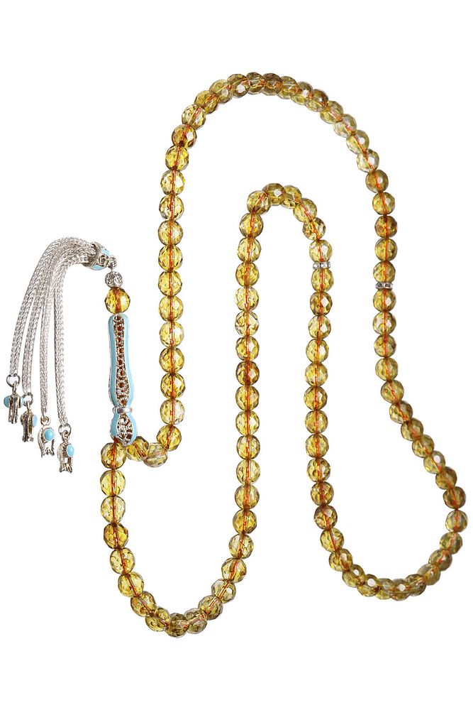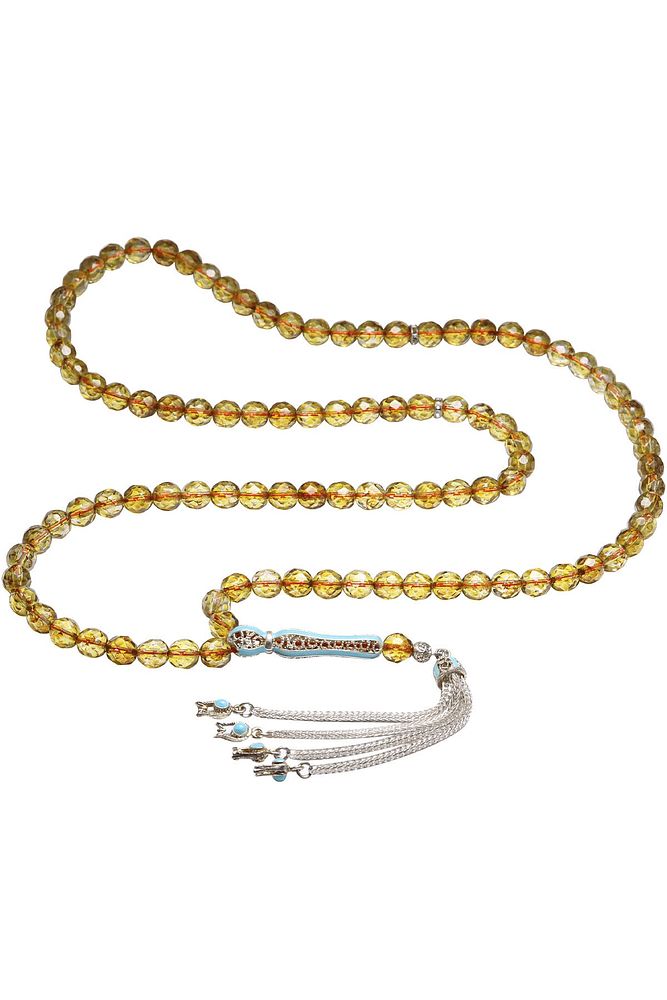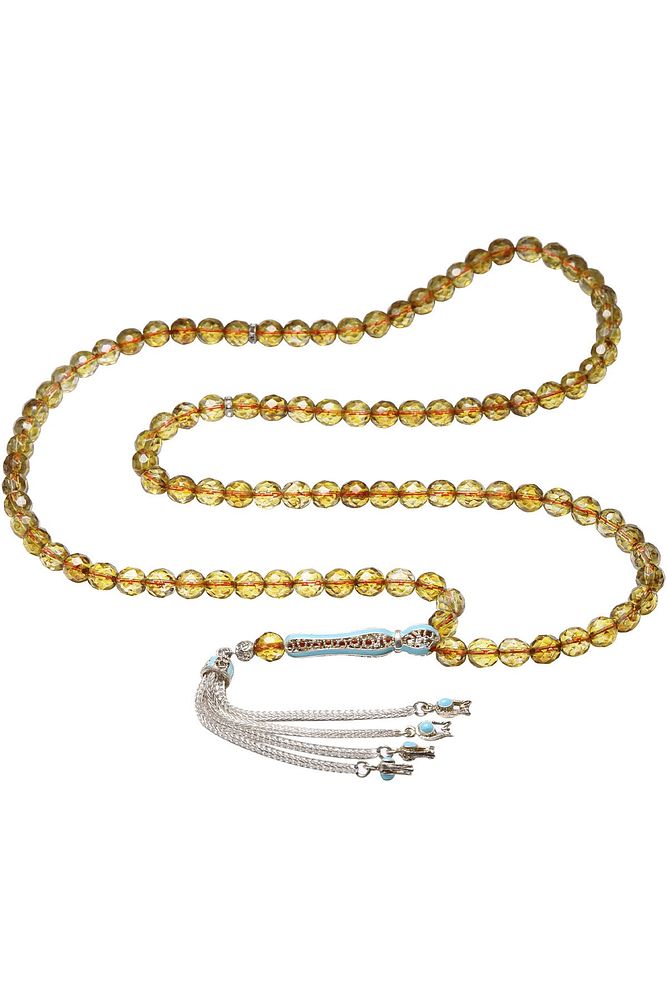 Sertifikalı Telkari Püskül 99\'luk Sarı Renk Doğal Kuvars Taşı Tesbih