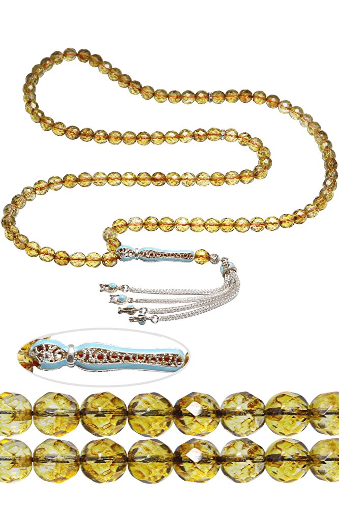 Ürün ya da Doğal Taş Açıklaması (Para - Sağlık - Pozitif Enerji Taşı) Kuvars tesbih modelleri, \'\'Tesbih Atölyesi\'\' Atölyelerinde ustalarımız tarafından kuru torna işciliği ile elde özen ile tane tane işlenmektedir. Ürünlerimiz el işciliği olduğu için sınırlı sayıda üretilmektedir. Tasarımlarımızda kullandığımız taşlar Dünya\'nın en kaliteli doğal taşlarını kullanmaktayız. Tasarımlarımızda kullandığımız doğal taşların hiç biri birbirinin aynısı olmadığı için küçükte olsa farklılık gösterebilir. Doğal taşlar vücudunuza temas ettiği anda negatif enerjilerinizi alır ve pozitif enerjiler verir. Bu tasarımda; Sarı renkli kuvars taşı ve Beyaz altın kaplama mavi mineli telkari imame ve püskül seti kullanılmıştır. Çift kaplama atılıdığı için renk atmaz ve kararmaz bir yapıya sahiptir. Yedek ip ile gönderim sağlanır. Üretildiği Taş; Kuvars; Ana Renk; Doğal Renk; Ağırlık; 40-50 gr; Tane Şekli; 7.5x7.5 mm; Tane Ölçüsü; Küre Kesim; Toplam Uzunluk; 40-50cm; İmame ve Püskül Maddesi; Düşük Ayar Gümüş;