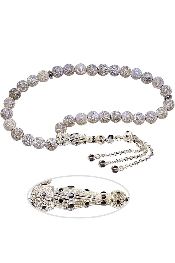 Sertifikalı Telkari Püskül Doğal Gri Akik Taşı Tesbih