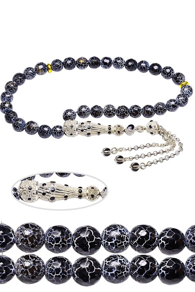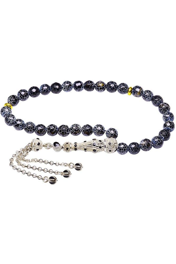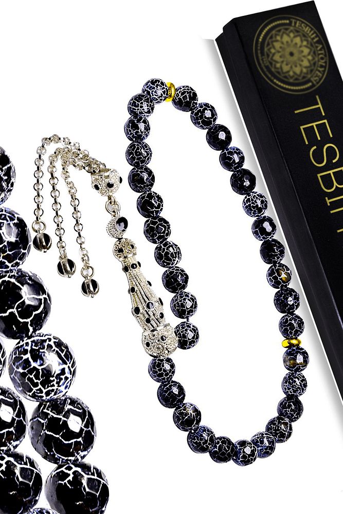 Ürün ya da Doğal Taş Açıklaması (Para, Bereket ve Pozitif Enerji Taşı) Akik tesbih modelleri, ''Tesbih Atölyesi'' Atölyelerinde ustalarımız tarafından kuru torna işciliği ile elde özen ile tane tane işlenmektedir. Ürünlerimiz el işciliği olduğu için sınırlı sayıda üretilmektedir. Tasarımlarımızda kullandığımız taşlar Dünya'nın en kaliteli akik taşlarını kullanmaktayız. Tasarımlarımızda kullandığımız doğal taşların hiç biri birbirinin aynısı olmadığı için küçükte olsa farklılık gösterebilir. Vücudunuza temas ettiği anda negatif enerjilerinizi alır ve pozitif enerjiler verir. Yedek ipi gönderilir ve ürünlerimiz ''Tesbih Atölyesi'' koruyucu ağaç kutusu ile gönderilmektedir. Bu tasarımda; Siyah damarlı doğal buz akik taşı ve beyaz siyah mineli beyaz altın kaplama telkari imame ve püskül seti kullanılmıştır. Çift kaplama atıldığı için renk atmaz ve kararmaz bir yapıya sahiptir. Üretildiği Taş; Akik Taşı; Ana Renk; Doğal Renk; Ağırlık; 20-30 gr; Tane Şekli; 8x8 mm; Tane Ölçüsü; Küre Kesim; Toplam Uzunluk; 20-30cm; İmame ve Püskül Maddesi; Düşük Ayar Gümüş;